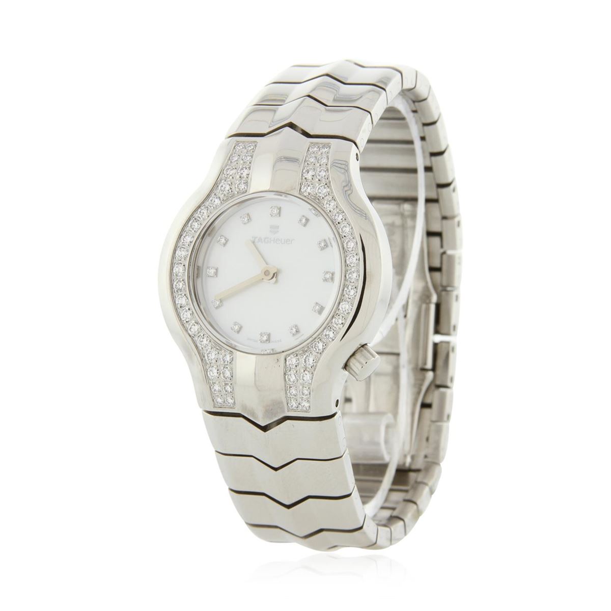 One Ladies Tag Heuer Stainless Steel Diamond Wristwatch featuring: Stainless Steel Case, Crown, Lugs and Bracelet, Diamond Bezel, White Dial with analog display, hour and second hands, diamond hour markers, sapphire crystal. Water resistant up to 100m.