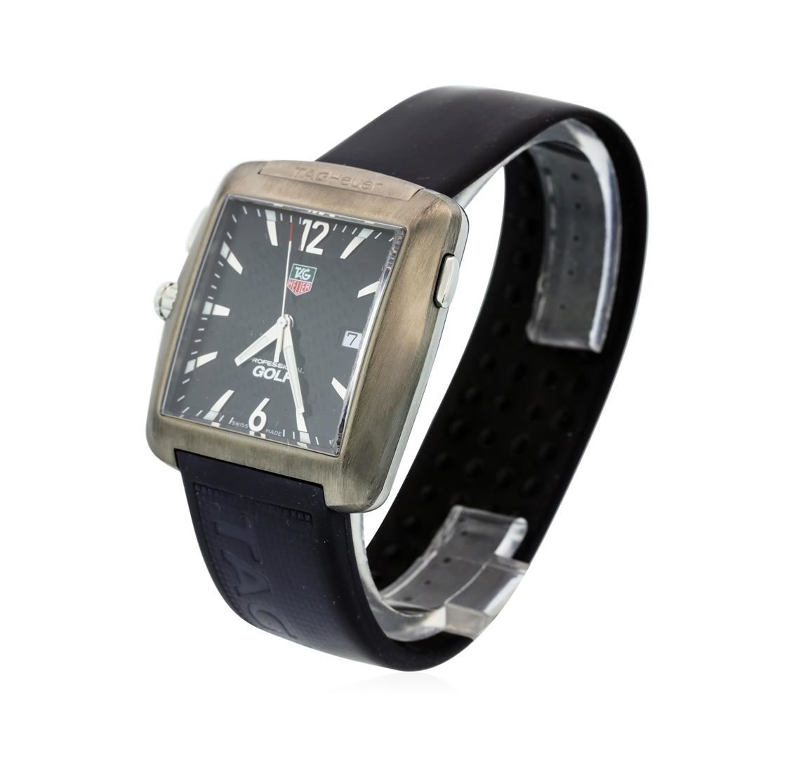 One Tag Heuer stainless steel Pro Golf Watch by Tiger Woods with a brushed titanium with steel case, a scratch resistant sapphire crystal, luminescent hands and markers and a black dial. The band is a Tag Heuer ergonomic black silicon elastic strap.