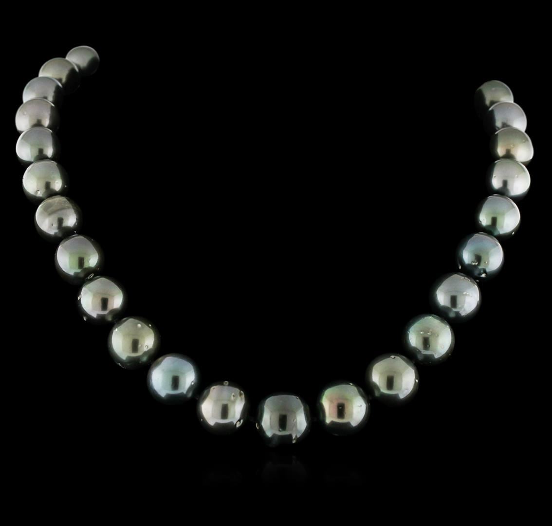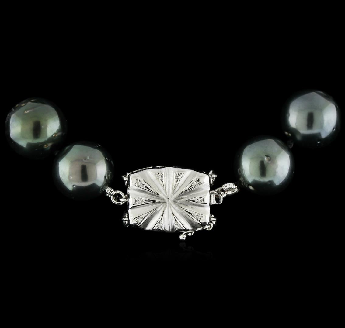 One graduated single strand pearl necklace 17.5" princess length, knotted with a 14KT white gold clasp containing 31 Tahitian pearls, 12.0mm in size to 15.5mm in size. The pearls are black in color with a very good luster, round to near round, moderately blemished Graded in the strand. Tahitian cultured pearls form in the large "Black Lipped" Pinctada Margaritifera oyster, which is about twice the size of the Japanese Akoya oyster. This warm water species from across the central and South Pacific Ocean is at home in the bays and lagoons of the islands & atolls of French Polynesia. Tahitian cultured pearl farmers generally raise their oysters in lagoons. Tahitian cultured pearls take from two to four years to form. Black pearls are known for their iridescent, vibrant, almost metallic natural colors, unique among saltwater cultured pearls. Though commonly called "Tahitian" pearls, they are actually gray, to a lighter or darker degree. Tahitian pearls have the unique ability to display a variety of colors at the same time, which can be seen glistening on their surface. Ten bead set single cut diamonds, measuring 1.10 - 1.10 x 0.66mm (depth est.) approximate total weight of 10 Stones = 0.05ct. Graded in the setting. Clarity: VS-2 to SI-1. Color: G - H. AIG Appraised at $36,235.00.