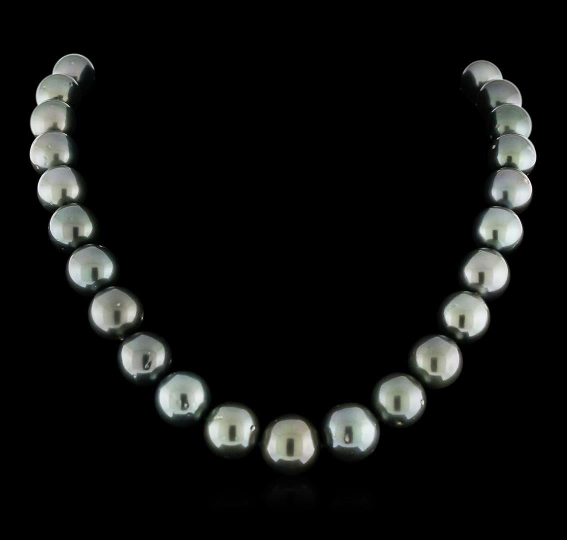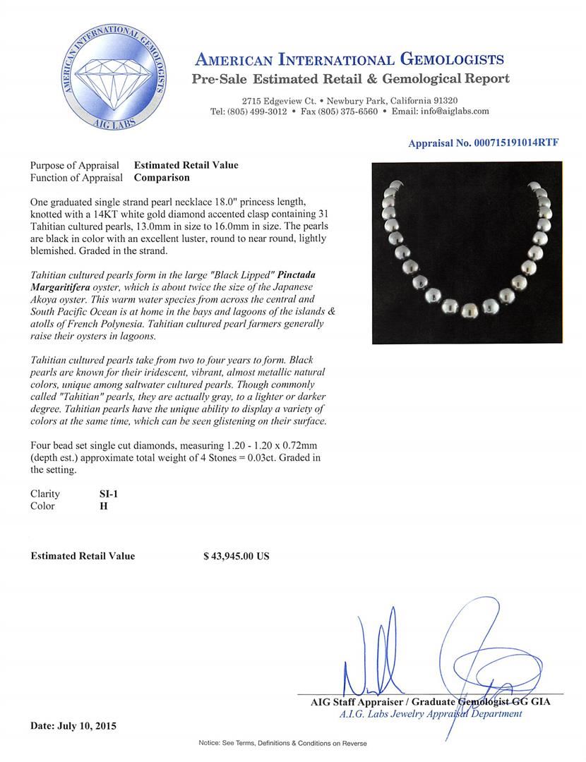 One graduated single strand pearl necklace 18.0" princess length, knotted with a 14KT white gold clasp containing 31 Tahitian pearls, 13.0mm in size to 16.0mm in size. The pearls are black in color with an excellent luster, round to near round, lightly blemished Graded in the strand. Tahitian cultured pearls form in the large "Black Lipped" Pinctada Margaritifera oyster, which is about twice the size of the Japanese Akoya oyster. This warm water species from across the central and South Pacific Ocean is at home in the bays and lagoons of the islands & atolls of French Polynesia. Tahitian cultured pearl farmers generally raise their oysters in lagoons. Tahitian cultured pearls take from two to four years to form. Black pearls are known for their iridescent, vibrant, almost metallic natural colors, unique among saltwater cultured pearls. Though commonly called "Tahitian" pearls, they are actually gray, to a lighter or darker degree. Tahitian pearls have the unique ability to display a variety of colors at the same time, which can be seen glistening on their surface. Four bead set single cut diamonds, measuring 1.20 - 1.20 x 0.72mm (depth est.) approximate total weight of 4 Stones = 0.03ct. Graded in the setting. Clarity: SI-1. Color: H. AIG Appraised at $43,945.00.
