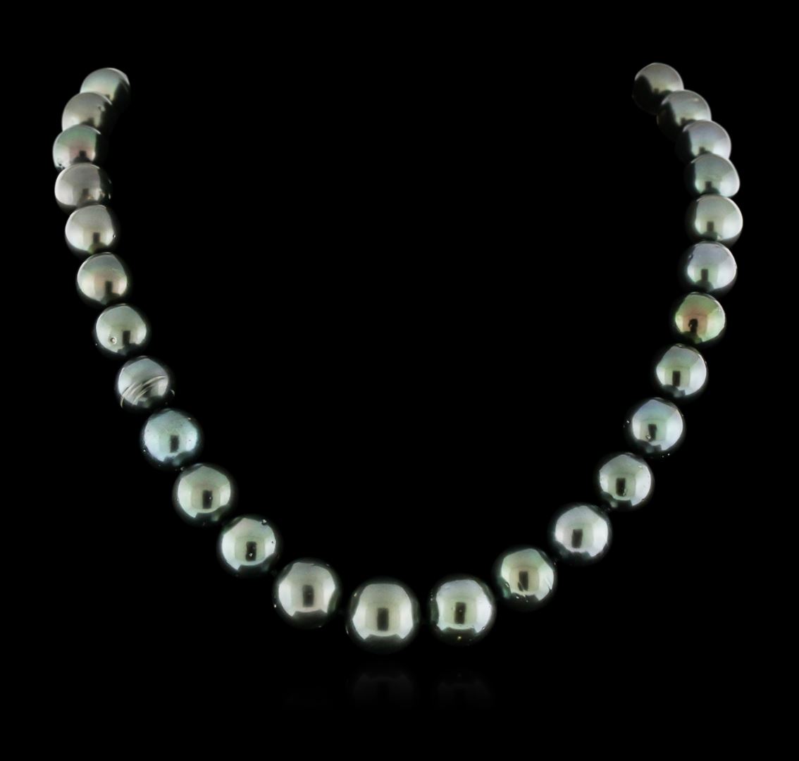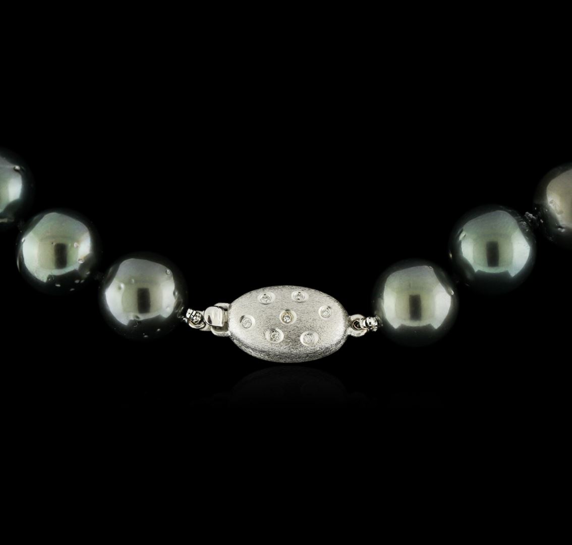 One graduated single strand pearl necklace 18.0" princess length, knotted with a 14KT white gold clasp containing 35 Tahitian pearls, 11.0mm in size to 15.0mm in size. The pearls are black in color with a very good luster, round to near round, lightly blemished Graded in the strand.Tahitian cultured pearls form in the large "Black Lipped" Pinctada Margaritifera oyster, which is about twice the size of the Japanese Akoya oyster. This warm water species from across the central and South Pacific Ocean is at home in the bays and lagoons of the islands & atolls of French Polynesia. Tahitian cultured pearl farmers generally raise their oysters in lagoons. Tahitian cultured pearls take from two to four years to form. Black pearls are known for their iridescent, vibrant, almost metallic natural colors, unique among saltwater cultured pearls. Though commonly called "Tahitian" pearls, they are actually gray, to a lighter or darker degree. Tahitian pearls have the unique ability to display a variety of colors at the same time, which can be seen glistening on their surface. Seven flush set round brilliant cut diamonds, measuring 1.10 - 1.00 x 0.63mm (depth est.) approximate total weight of 7 Stones = 0.04ct. Graded in the setting. Clarity: SI-1 to SI-2. Color: H - I. AIG Appraised at $37,255.00.