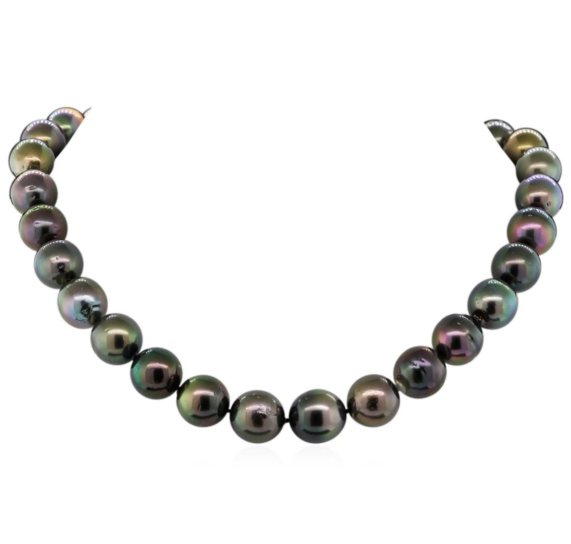 One graduated single strand pearl necklace 18.5" princess length, knotted with a 14KT white gold diamond accent clasp containing 30 Tahitian pearls, 11.0mm in size to 14.5mm in size. The pearls are black in color with a good luster, off round, lightly blemished Graded in the strand. Tahitian cultured pearls form in the large "Black Lipped" Pinctada Margaritifera oyster, which is about twice the size of the Japanese Akoya oyster. This warm water species from across the central and South Pacific Ocean is at home in the bays and lagoons of the islands & atolls of French Polynesia. Tahitian cultured pearl farmers generally raise their oysters in lagoons. Tahitian cultured pearls take from two to four years to form. Black pearls are known for their iridescent, vibrant, almost metallic natural colors, unique among saltwater cultured pearls. Though commonly called "Tahitian" pearls, they are actually gray, to a lighter or darker degree. Tahitian pearls have the unique ability to display a variety of colors at the same time, which can be seen glistening on their surface. Twenty-Eight bead set single cut diamonds, measuring 1.00 - 1.00 x 0.60mm (depth est.) approximate total weight of 28 Stones = 0.12ct. Graded in the setting. Clarity: SI-2 to I-1. Color: G - I. AIG Appraised at $12,430.00.