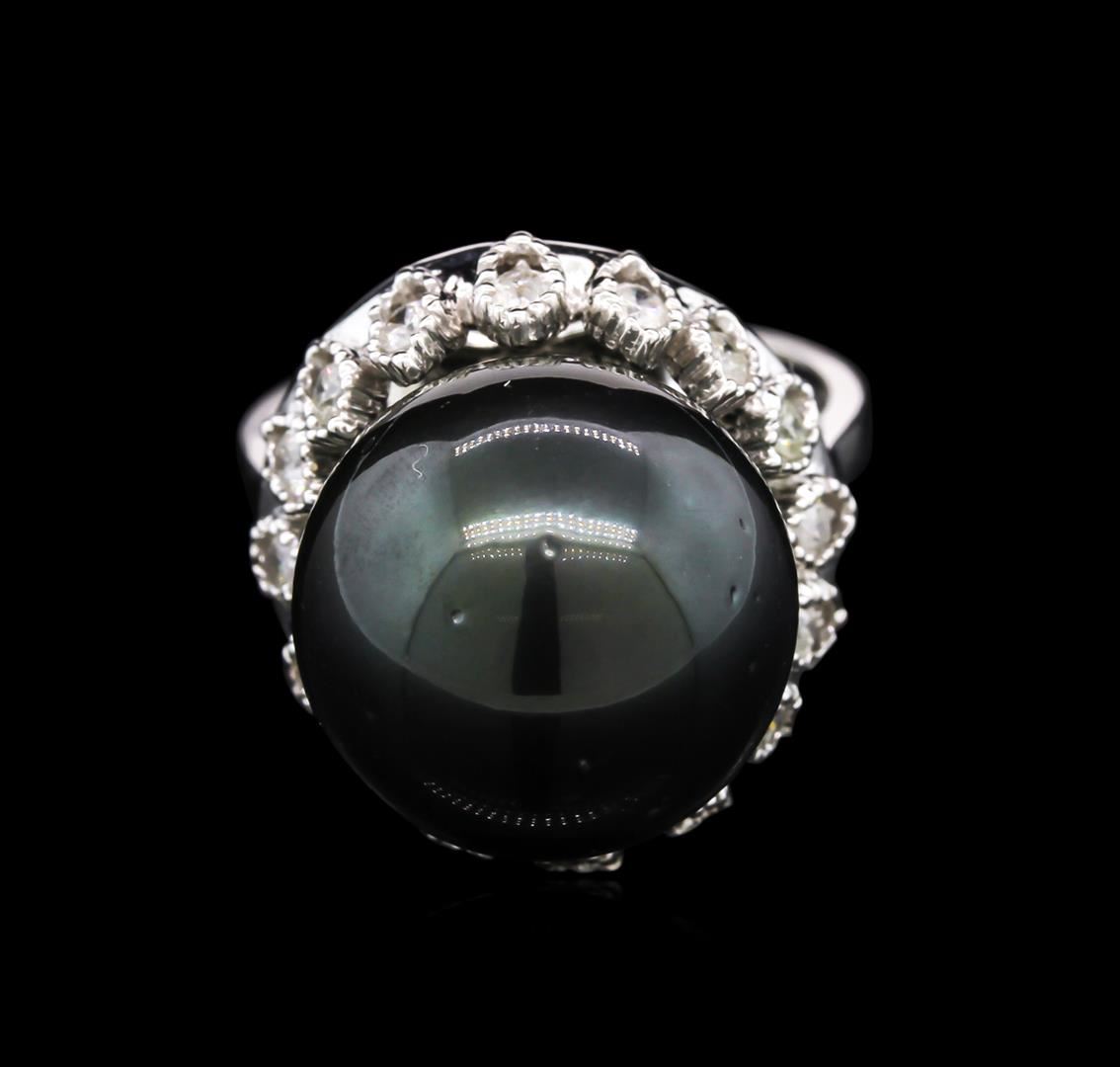 One electronically tested white gold ladies cast Tahitian cultured pearl and diamond ring. Condition is new, good workmanship. The featured Tahitian cultured pearl is set within a stylized diamond bezel, completed by a two and one-half millimeter wide band. Bright polish finish with milgrain detailing. Containing: One Tahitian cultured pearl, 15.0mm in size. The pearl is black in color and exhibiting orient with a high luster, thick nacre, mosey round, lightly spotted Graded in the setting. Tahitian cultured pearls form in the large "Black Lipped" Pinctada Margaritifera oyster, which is about twice the size of the Japanese Akoya oyster. This warm water species from across the central and South Pacific Ocean is at home in the bays and lagoons of the islands & atolls of French Polynesia. Tahitian cultured pearl farmers generally raise their oysters in lagoons. Tahitian cultured pearls take from two to four years to form. Black pearls are known for their iridescent, vibrant, almost metallic natural colors, unique among saltwater cultured pearls. Though commonly called "Tahitian" pearls, they are actually gray, to a lighter or darker degree. Tahitian pearls have the unique ability to display a variety of colors at the same time, which can be seen glistening on their surface. Sixteen half bezel set round brilliant cut diamonds, measuring 2.00 - 1.90 x 1.17mm (depth est.) approximate total weight of 16 Stones = 0.5 let. Graded in the setting. Clarity: I-1 to I-2.Color: H - J. AIG Appraised at $5,905.00.