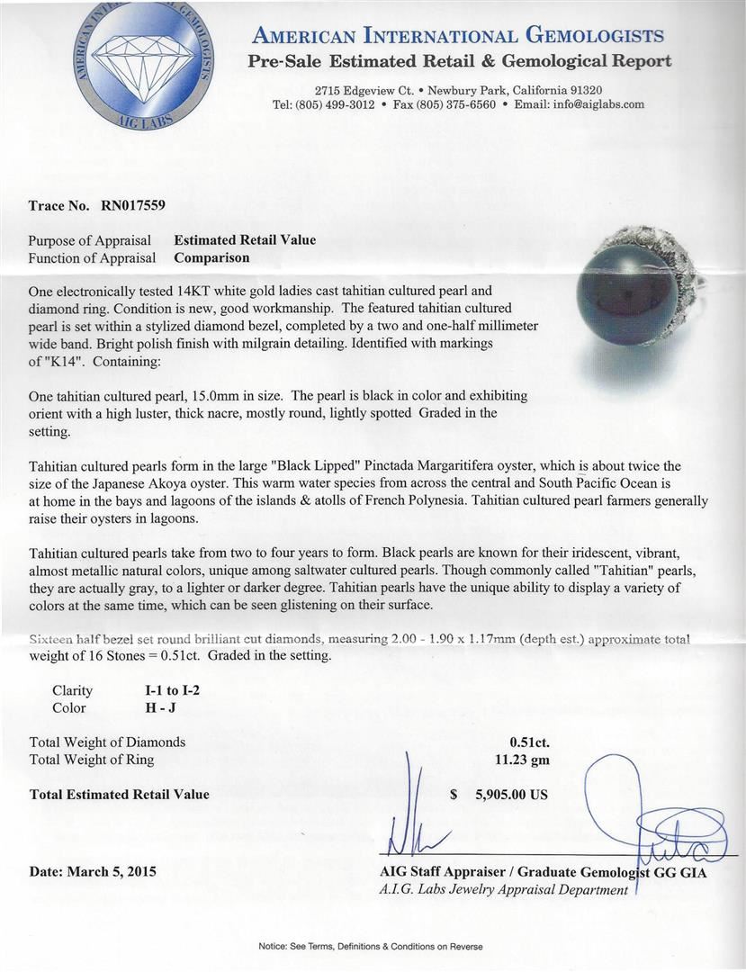 One electronically tested white gold ladies cast Tahitian cultured pearl and diamond ring. Condition is new, good workmanship. The featured Tahitian cultured pearl is set within a stylized diamond bezel, completed by a two and one-half millimeter wide band. Bright polish finish with milgrain detailing. Containing: One Tahitian cultured pearl, 15.0mm in size. The pearl is black in color and exhibiting orient with a high luster, thick nacre, mosey round, lightly spotted Graded in the setting. Tahitian cultured pearls form in the large "Black Lipped" Pinctada Margaritifera oyster, which is about twice the size of the Japanese Akoya oyster. This warm water species from across the central and South Pacific Ocean is at home in the bays and lagoons of the islands & atolls of French Polynesia. Tahitian cultured pearl farmers generally raise their oysters in lagoons. Tahitian cultured pearls take from two to four years to form. Black pearls are known for their iridescent, vibrant, almost metallic natural colors, unique among saltwater cultured pearls. Though commonly called "Tahitian" pearls, they are actually gray, to a lighter or darker degree. Tahitian pearls have the unique ability to display a variety of colors at the same time, which can be seen glistening on their surface. Sixteen half bezel set round brilliant cut diamonds, measuring 2.00 - 1.90 x 1.17mm (depth est.) approximate total weight of 16 Stones = 0.5 let. Graded in the setting. Clarity: I-1 to I-2.Color: H - J. AIG Appraised at $5,905.00.