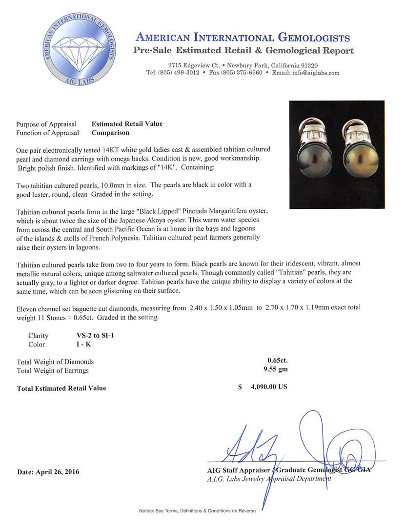 One pair electronically tested 14KT white gold ladies cast & assembled Tahitian cultured pearl and diamond earrings with omega backs. Bright polish finish. Identified with markings of "14K". Condition is new, good workmanship. Containing: Two Tahitian cultured pearls, 10.0mm in size. The pearls are black in color with a good luster, round, clean Graded in the setting. Tahitian cultured pearls form in the large "Black Lipped" Pinctada Margaritifera oyster, which is about twice the size of the Japanese Akoya oyster. This warm water species from across the central and South Pacific Ocean is at home in the bays and lagoons of the islands & atolls of French Polynesia. Tahitian cultured pearl farmers generally raise their oysters in lagoons. Tahitian cultured pearls take from two to four years to form. Black pearls are known for their iridescent, vibrant, almost metallic natural colors, unique among saltwater cultured pearls. Though commonly called "Tahitian" pearls, they are actually gray, to a lighter or darker degree. Tahitian pearls have the unique ability to display a variety of colors at the same time, which can be seen glistening on their surface. Eleven channel set baguette cut diamonds, measuring from 2.40 x 1.50 x 1.05mm to 2.70 x 1.70 x 1.19mm exact total weight 11 Stones = 0.65ct. Graded in the setting. Clarity: VS-2 to SI-1. Color: I - K. Total Weight of Diamonds 0.65ct. Total Weight of Earrings 9.55gm. AIG Appraised at $4,090.00.