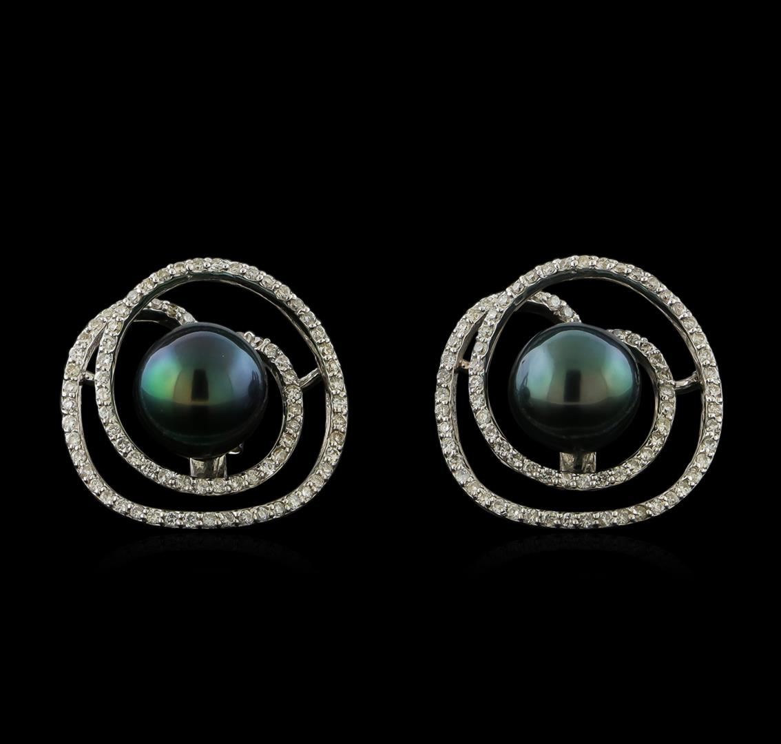 One pair electronically tested 14KT white gold lady's combination cast & assembled designer button style earrings with friction posts with a bright polish finish. Identified with markings of "14K". Condition is new, good workmanship. Containing: Two Tahitian pearls, 11.5mm in size to 10.8mm in size. The pearls are black in color, green overtone with a good luster, round to near round, and clean with good matching. Graded in the setting. One Hundred Sixty-Four prong set round brilliant cut diamonds, measuring 1.30 - 1.20 x 0.78mm (depth est.) approximate total weight of 164 Stones = 1.26ct. Graded in the setting. Clarity: SI-1 to I-1. Color: H - I. Cut Good. Total Weight of Diamonds 1.26ct. Total Weight of Earrings 11.20gm. GAS Appraised at $8,075.00.