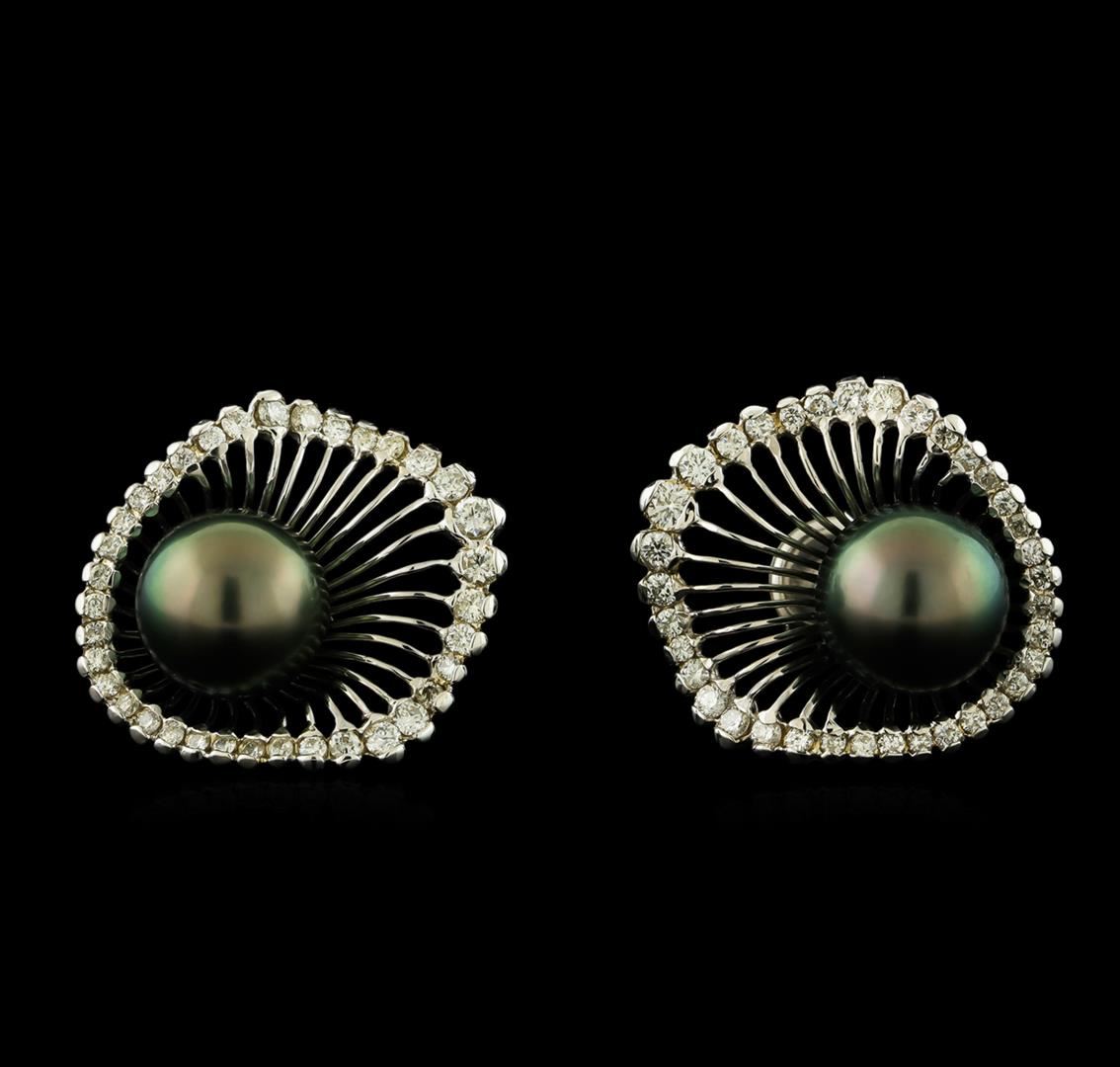 One pair electronically tested 14KT white gold lady's combination cast & assembled fashion earrings with friction posts with a bright polish finish. Identified with markings of "14K". Condition is new, good workmanship. Containing: Two Tahitian pearls, 10.7mm in size to 10.6mm in size. The pearls are black in color, green overtone with a very good luster, round, and mostly clean with excellent matching. Graded in the setting. Six prong set round brilliant cut diamonds, measuring 2.60 - 2.40 x 1.50mm (depth est.) approximate total weight of 6 Stones = 0.32ct. Graded in the setting. Clarity: SI-1 to SI-2. Color: H - I. Cut Good Sixty-Six prong set round brilliant cut diamonds, measuring 1.80 - 1.50 x 0.99mm (depth est.) approximate total weight of 66 Stones = 1.05ct. Graded in the setting. Clarity: SI-1 to I-1. Color: H - I. Cut Good. Total Weight of Diamonds 1.37ct. Total Weight of Earrings 9.10gm. GAS Appraised at $7,340.00.
