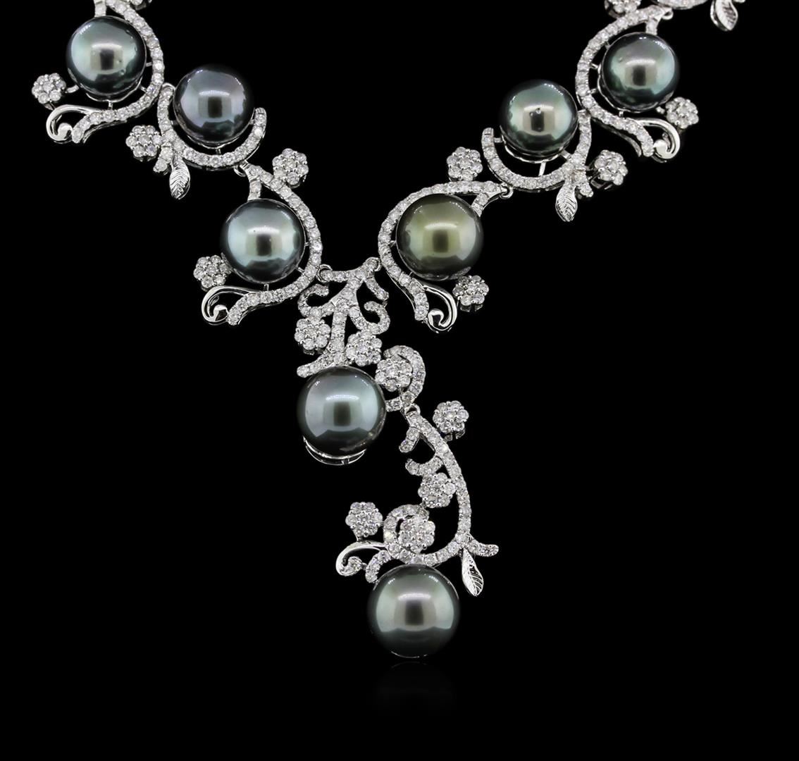 One electronically tested 14KT white gold ladies cast & assembled Tahitian cultured pearl and diamond necklace. Condition is new, good workmanship. Seventeen and one-half inch length necklace features an elaborate Tahitian cultured pearl and diamond set floral chevron design with matching drop. The necklace transitions into white gold links, terminating in a concealed clasp with twin safeties. Bright polish finish. Trademark is Orianne. Identified with markings of "14K". Containing: Ten Tahitian pearls, 10.5mm in sixe to 11.5mm in sixe. The pearls are black in color with a good luster, round, lightly blemished with good matching Graded in the setting. Tahitian cultured pearls form in the large "Black Lipped" Pinctada Margaritifera, oyster which is about twice the size of the Japanese Akoya oyster. This warm water species from across the central and South Pacific Ocean is at home in the bays and lagoons of the islands and atolls of French Polynesia. Tahitian cultured pearl farmers generally raise their oysters in lagoons. Tahitian cultured pearls take from two to four years to form. Tahitian cultured pearls are known for their iridescent, vibrant, almost metallic natural colors, unique among saltwater cultured pearls. Though commonly called "Tahitian" pearls, black pearls are actually gray, to lighter or darker degree. Black pearls have the unique ability to display a variety of colors at the same time, which can be seen glistening on their surface. Four hundred seventy-eight prong set round brilliant cut diamonds approximate total weight of 478 Stones = 8.79ct. Graded in the setting. Clarity: I-1 to I-2. Color: G - H. Total Weight of Diamonds: 8.79ct. Total Weight of Necklace: 55.23gm. AIG Appraised at $32,720.00.