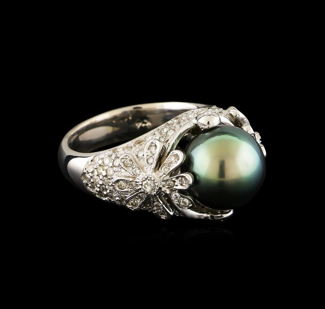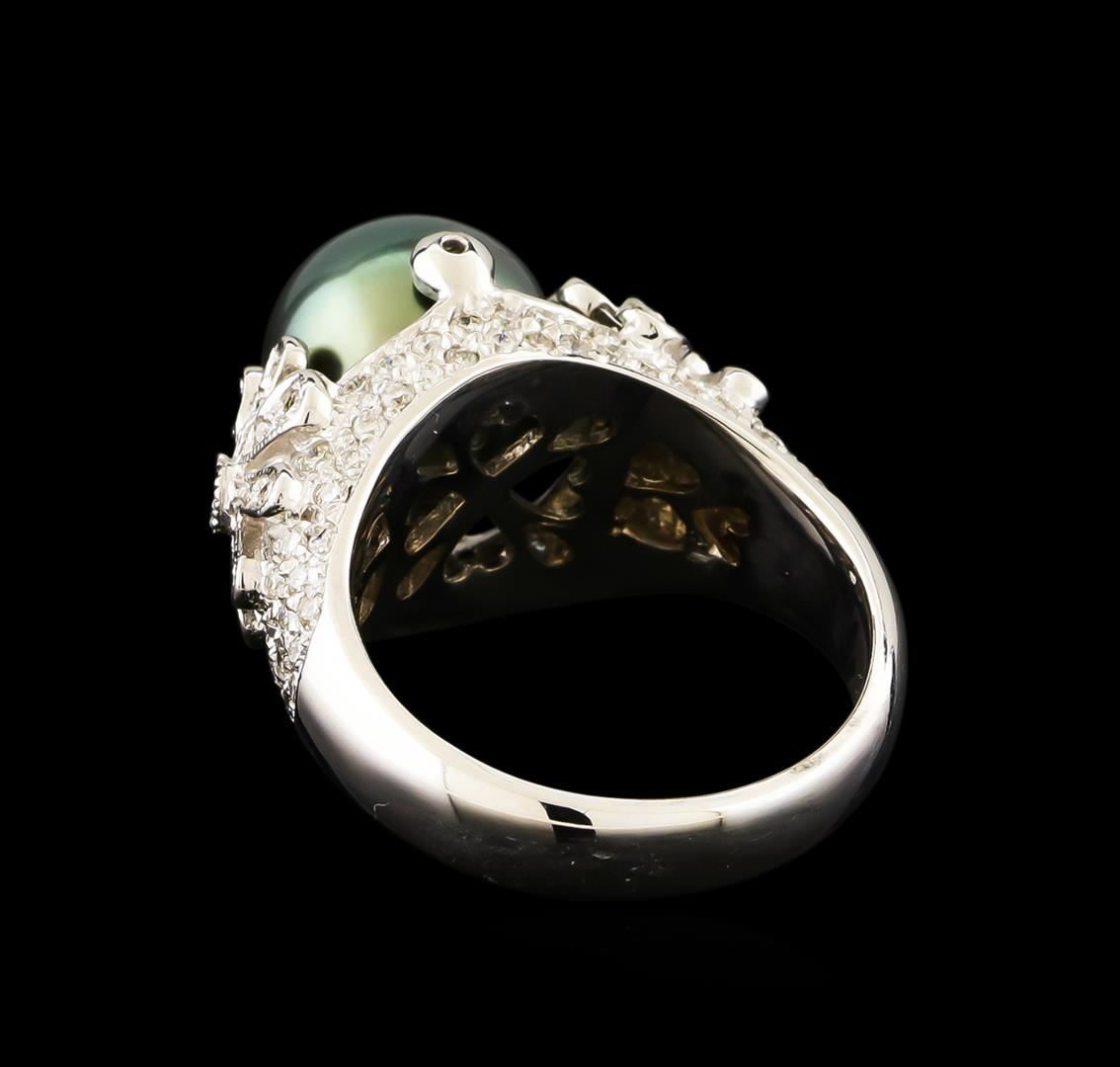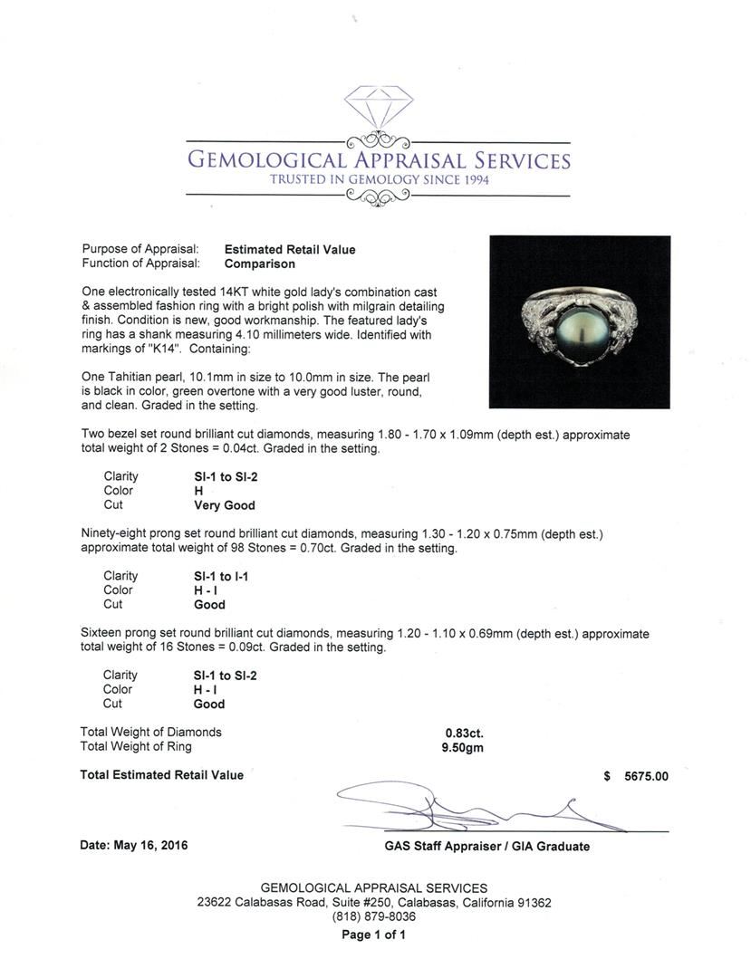 One electronically tested 14KT white gold lady's combination cast & assembled fashion ring with a bright polish with milgrain detailing finish. The featured lady's ring has a shank measuring 4.10 millimeters wide. Identified with markings of "K14". Condition is new, good workmanship. Containing: One Tahitian pearl, 10.1mm in size to 10.0mm in size. The pearl is black in color, green overtone with a very good luster, round, and clean. Graded in the setting. Two bezel set round brilliant cut diamonds, measuring 1.80 - 1.70 x 1.09mm (depth est.) approximate total weight of 2 Stones = 0.04ct. Graded in the setting. Clarity: SI-1 to SI-2. Color: Very Good Ninety-Eight prong set round brilliant cut diamonds, measuring 1.30 - 1.20 x 0.75mm (depth est.) approximate total weight of 98 Stones = 0.70ct. Graded in the setting. Clarity: SI-1 to I-1. Color: H - I. Cut Good Sixteen prong set round brilliant cut diamonds, measuring 1.20 - 1.10 x 0.69mm (depth est.) approximate total weight of 16 Stones = 0.09ct. Graded in the setting. Clarity: SI-1 to SI-2. Color: H - I. Cut Good. Total Weight of Diamonds 0.83ct. Total Weight of Ring 9.50gm. GAS Appraised at $5,675.00.