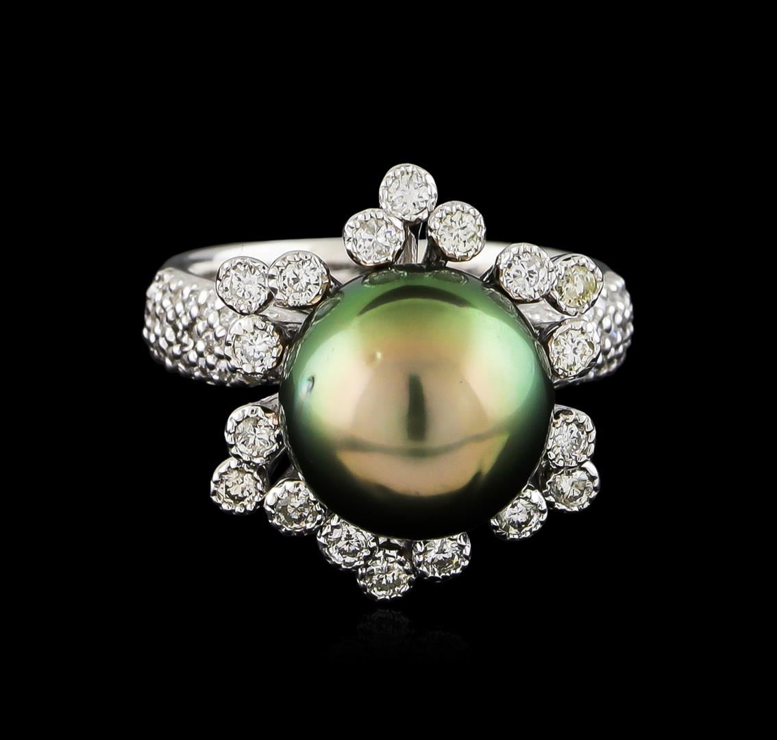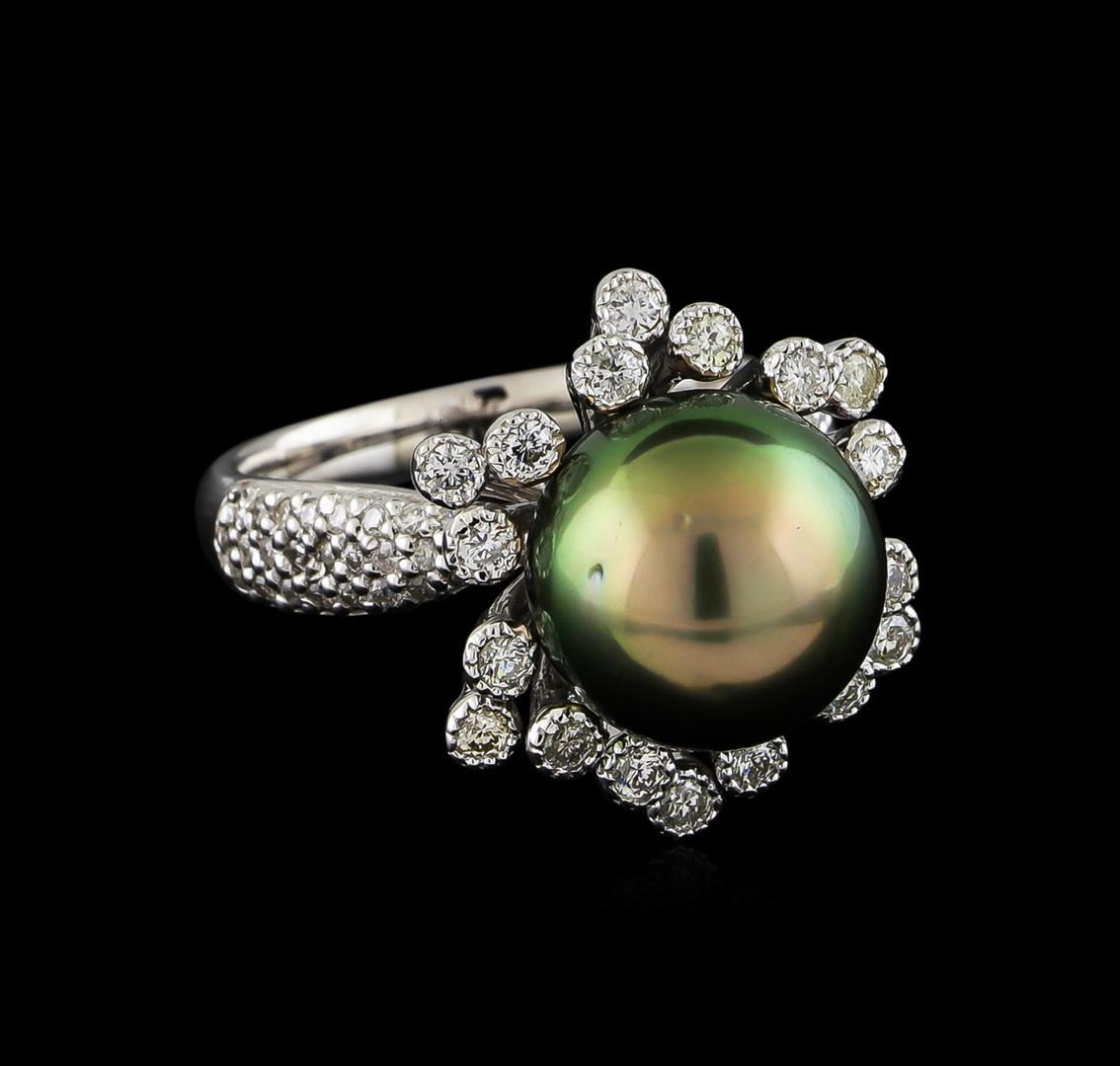 One electronically tested 14KT white gold ladies cast Tahitian cultured pearl and diamond ring with a bright polish finish. The featured Tahitian cultured pearl is set within a diamond floret bezel supported by diamond set shoulders, completed by three millimeter wide band. Identified with markings of "K14". Condition is new, good workmanship. Containing: One Tahitian cultured pearl, 11.5mm in size. The pearl is black in color with a very good luster, round, mostly clean Graded in the setting. Tahitian cultured pearls form in the large "Black Lipped" Pinctada Margaritifera oyster, which is about twice the size of the Japanese Akoya oyster. This warm water species from across the central and South Pacific Ocean is at home in the bays and lagoons of the islands &atolls of French Polynesia. Tahitian cultured pearl farmers generally raise their oysters in lagoons. Tahitian cultured pearls take from two to four years to form. Black pearls are known for their iridescent, vibrant, almost metallic natural colors, unique among saltwater cultured pearls. Though commonly called "Tahitian" pearls, they are actually gray, to a lighter or darker degree. Tahitian pearls have the unique ability to display a variety of colors at the same time, which can be seen glistening on their surface. Eighteen bezel set round brilliant cut diamonds, measuring 1.80 - 1.70 x 1.05mm (depth est.) approximate total weight of 18 Stones = 0.45ct. Graded in the setting. Clarity: I-1 to I-2. Color: G - H Fifty-Four bead set round brilliant cut diamonds, measuring 1.10 - 1.00 x 0.63mm (depth est.) approximate total weight of 54 Stones = 0.32ct. Graded in the setting. Clarity: I-1 to I-2. Color: G - I. Total Weight of Diamonds 0.77ct. Total Weight of Ring 9.86gm. AIG Appraised at $4,275.00.