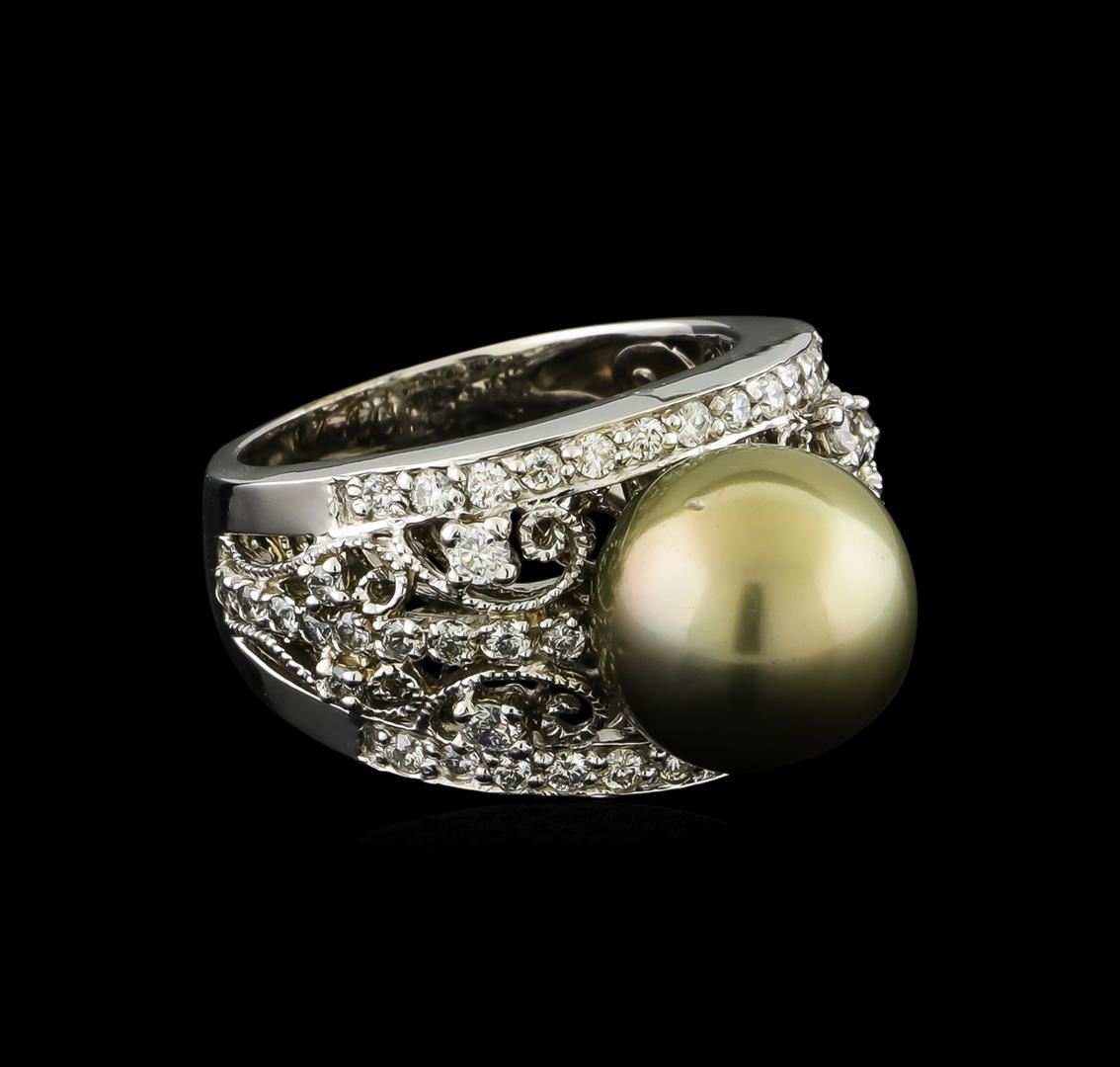 One electronically tested 14KT white gold lady's cast fashion ring with a bright polish with milgrain detailing finish. The featured lady's ring has a shank measuring 4.86 millimeters wide. Identified with markings of "14K". Condition is new, good workmanship. Containing: One Tahitian pearl, 11.3mm in size to 11.1mm in size. The pearl is silver in color, green overtone with a good luster, near round, and clean. Graded in the setting. Forty-Six prong set round brilliant cut diamonds, measuring 1.60 - 1.55 x 0.98mm (depth est.) approximate total weight of 46 Stones = 0.68ct. Graded in the setting. Clarity: VS-2 to SI-2. Color: G - Good Four prong set round brilliant cut diamonds, measuring 2.25 - 2.15 x 1.36mm (depth est.) approximate total weight of 4 Stones = 0.16ct. Graded in the setting. Clarity: VS-2 to SI-1. Color: H - I. Cut Very Good. Total Weight of Diamonds 0.84ct. Total Weight of Ring 10.60gm. GAS Appraised at $5,270.00.