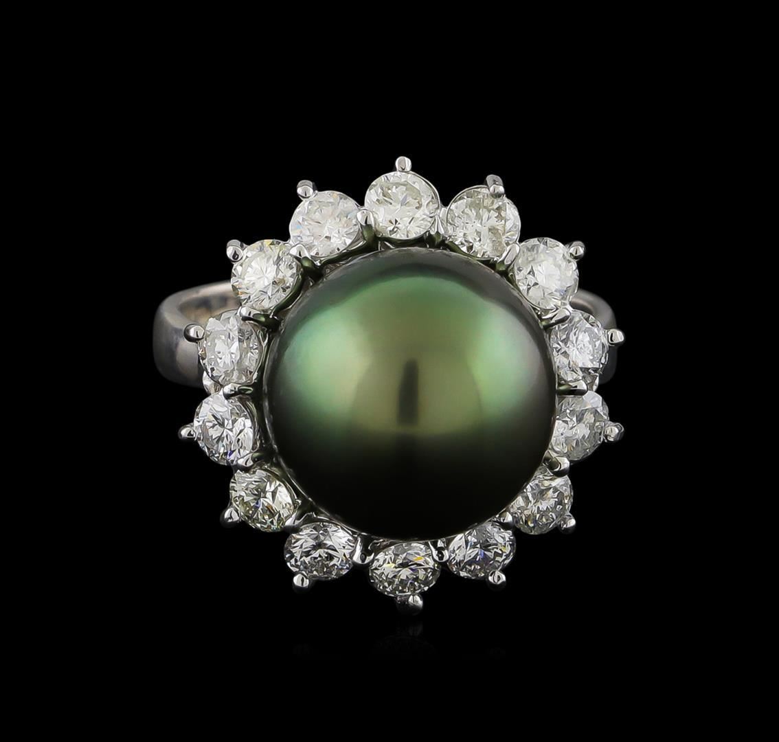 One electronically tested 14KT white gold lady's cast fashion ring with a basket halo with a bright polish finish. The featured lady's ring has a shank measuring 3.20 millimeters wide. Identified with markings of "K14". Condition is new, good workmanship. Containing: One Tahitian pearl, 11.8mm in size to 11.7mm in size. The pearl is black in color, green overtone with a good luster, round, and clean. Graded in the setting. Fourteen prong set round brilliant cut diamonds, measuring 3.05 - 2.95 x 1.86mm (depth est.) approximate total weight of 14 Stones = 1.43ct. Graded in the setting. Clarity: SI-1 to I-1. Color: H - I. Cut Good. Total Weight of Diamonds 1.43ct. Total Weight of Ring 7.70gm. GAS Appraised.