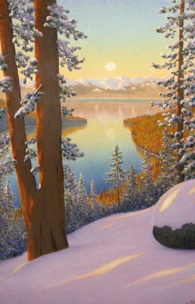 Tahoe Calm by Bill Jewell shows the lake in a snowy landscape on a framed original oil on canvas.The size is 46" x 34".