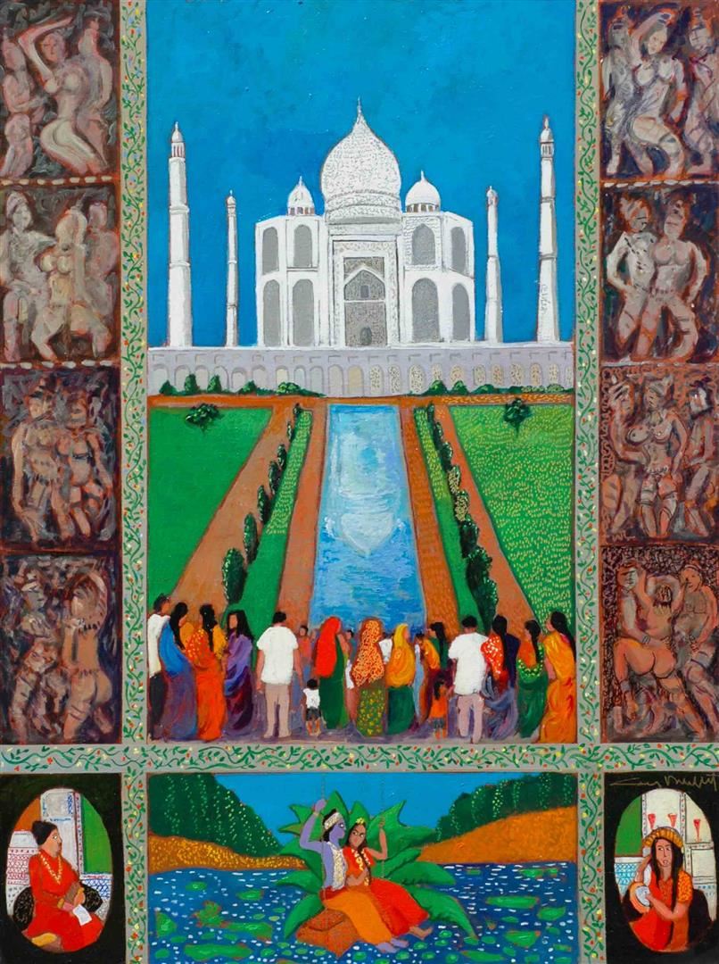 Taj Mahal by Guy Buffet . For this 40x30" acrylic on canvas, World famous French Naïve artist Guy Buffet went to india to meet with the Dalai Lama about a special project and visited the incredible Taj Mahal. This inspired his whimsical "Taj Mahal" as a colorful and sexy painting of the Palace of Love. The side panels feature Kama Sutra poses!