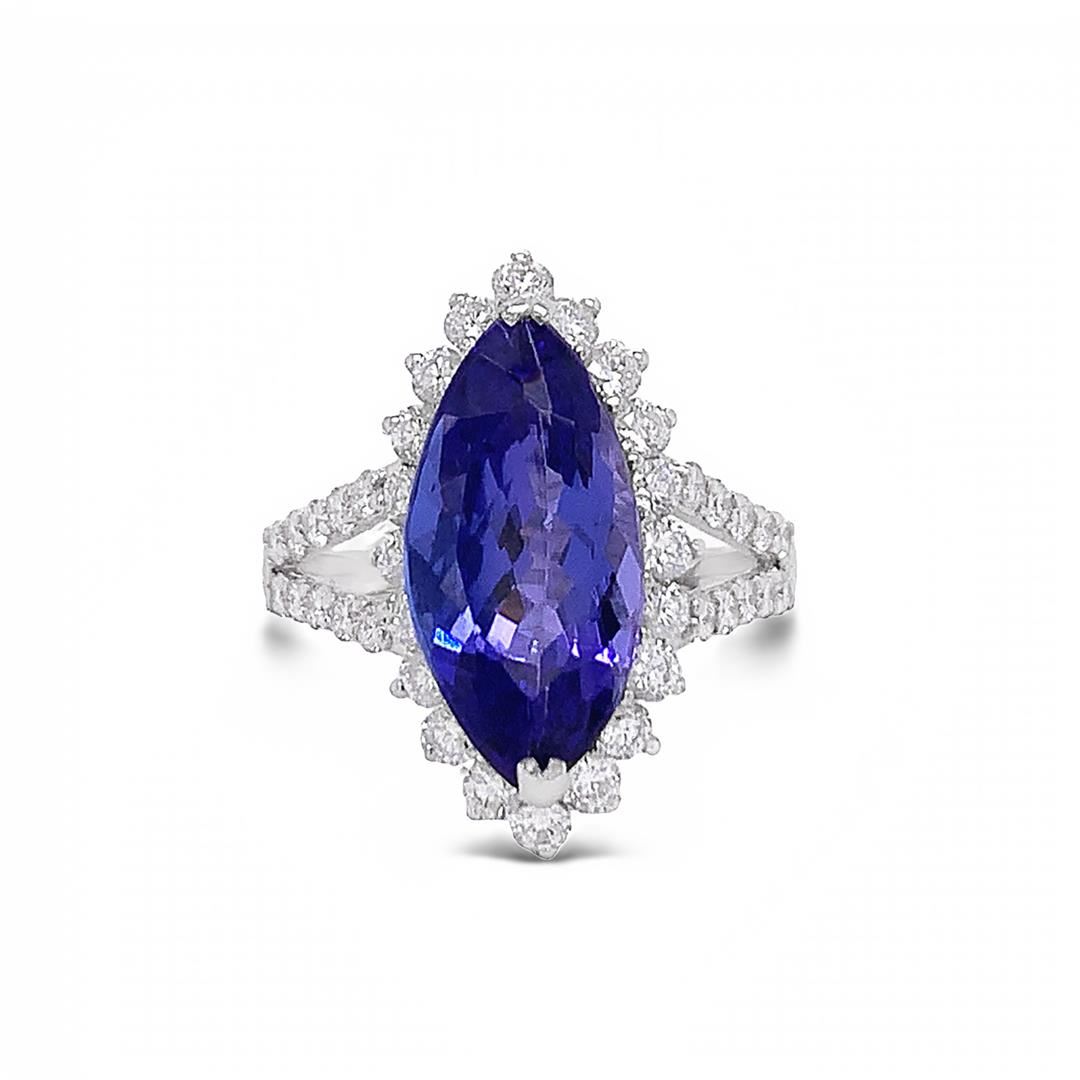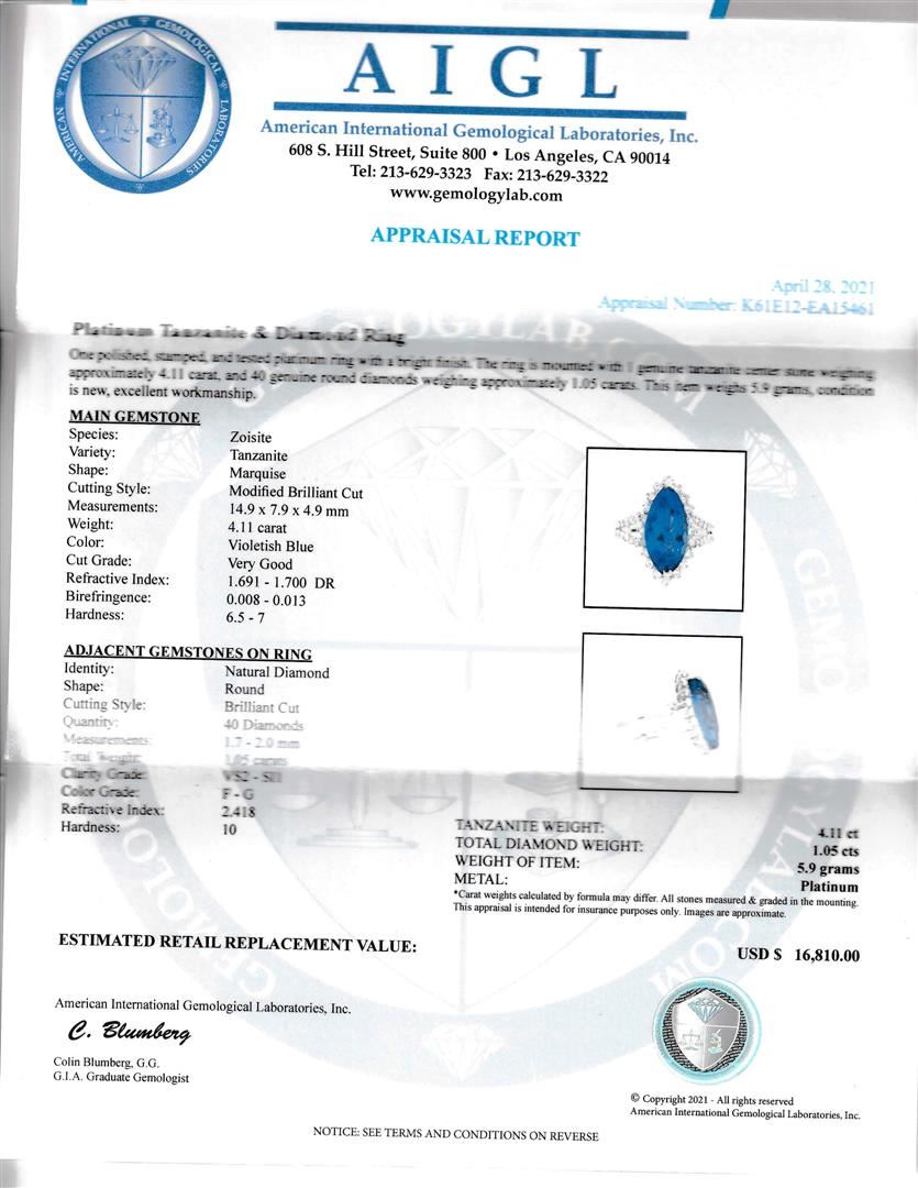 Tanzanite Marquis Ring. Please see Photos and Description for all available information. This vibrant, celebratory tanzanite ring features a 4.11ct tanzanite center stone, set in a platinum setting with 1.05ct of diamonds. The vibrant blue color of the tanzanite stone is framed by a row of diamonds and complemented by platinum.