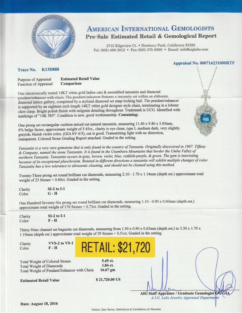 Tanzanite Pendant. Please see Photos and Description for all available information. Whether you're looking for a gift for a loved one or for yourself, this stunning tanzanite pendant is the one for you. It features a 5.45ct AAA quality tanzanite stone that is set in a beautiful 14k white gold pendant. This piece is a sure way to make a statement, and you can wear it every day. You can also buy this for someone you love.