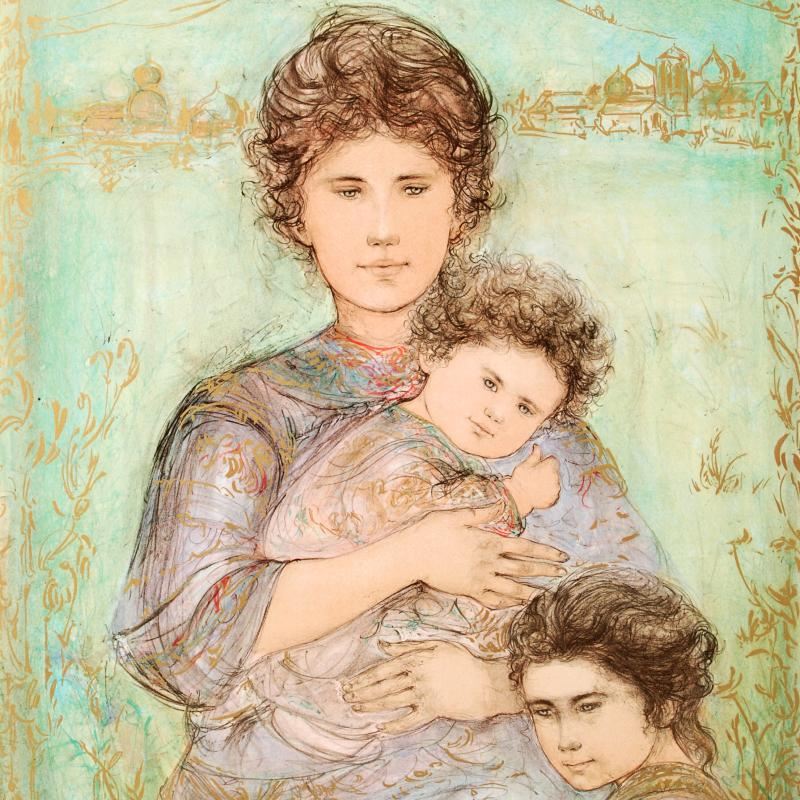 "Tatyana's Family" is a limited edition lithograph on paper, numbered and hand signed by Edna Hibel (1917-2014). Includes Certificate of Authenticity! Measures approx. 30" x 42" (with border), 28" x 39.5" (image).