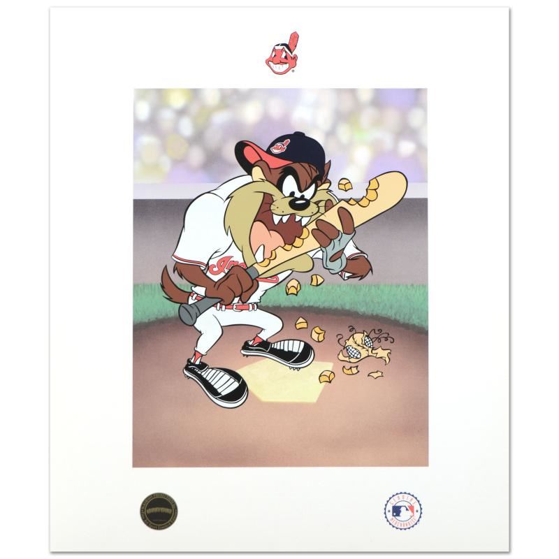 "Taz (Indians)" is a licensed collectible mixed media print on art paper from Looney Tunes. This piece bears the official seal from Looney Tunes and MLB. Measures approx. 19" x 22.5" (with border), 12" x 21" (image).