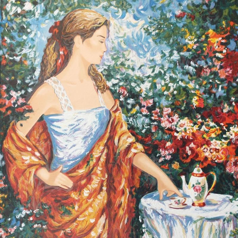 Tea Time by Semeko, Igor. "Tea Time" is a limited edition Serigraph on Paper by Igor Semeko. The piece is numbered, hand signed by the artist, and come with a letter of authenticity. Measures approximately 19.5" x 16".
