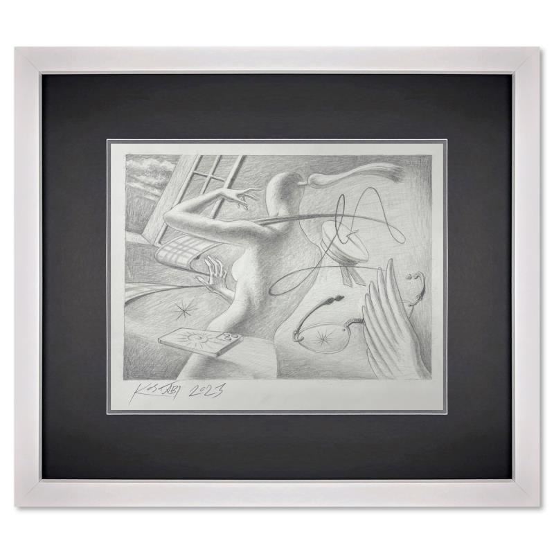 "Tech Tempest" is an original drawing on paper by Mark Kostabi, hand signed by the artist. This piece comes custom framed and includes a certificate of authenticity. Measures approximately 13.5" x 15" (frame), 7.5" x 9" (image). This item requires special handling and may have a longer than usual turnaround.
