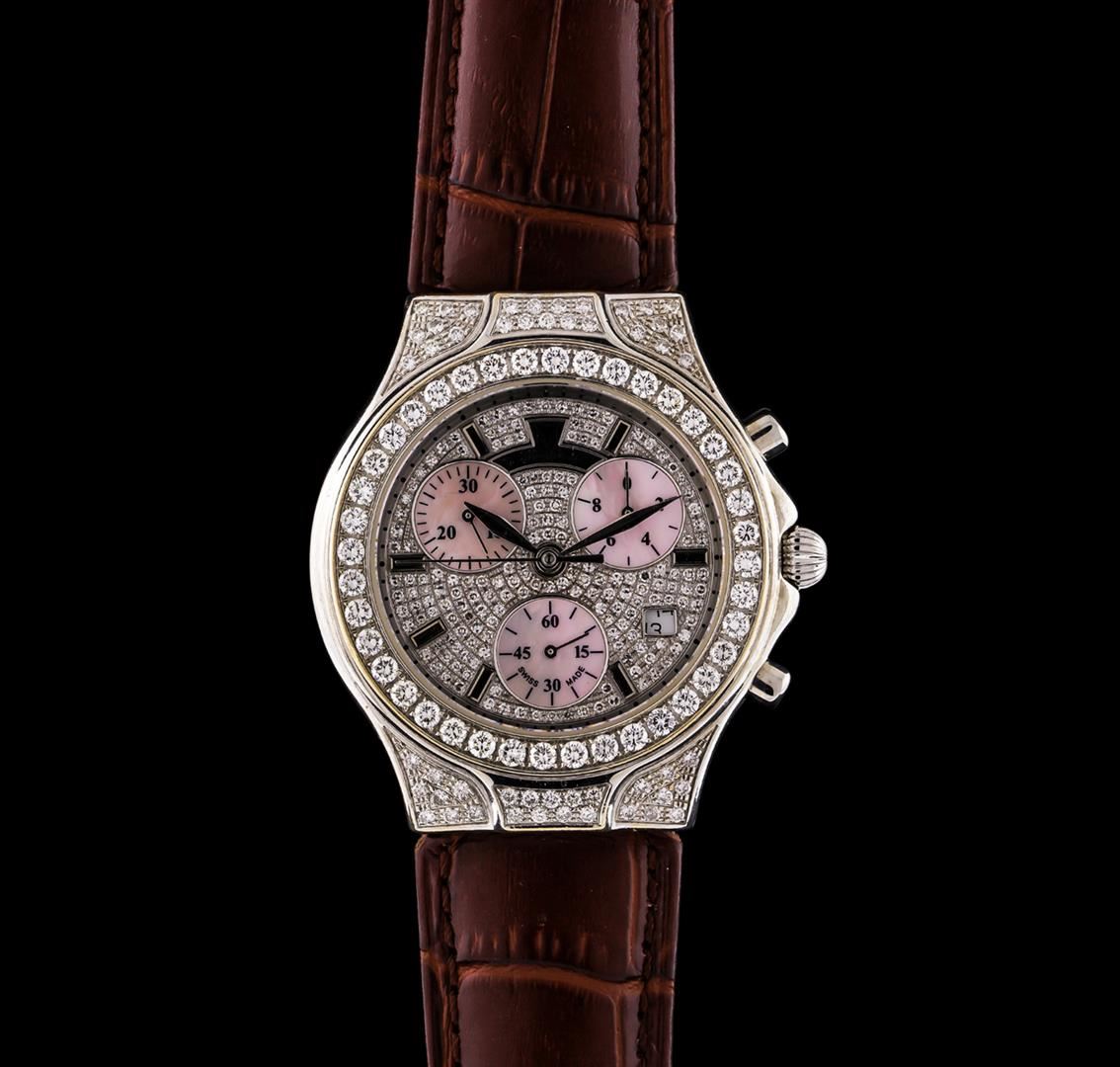 One, Techno Marine Chronograph wristwatch electronically tested Stainless Steel, Case: 40mm diameter, Case Lugs: diamond set, Swiss Hallmarked 18KT White gold Case Back: engraved with the manufacturers name, information and ID numbers, Bezel: diamond set, Crown: locking within protective shoulders, Crystal: synthetic sapphire. Diamond Set Dial: baton narrow pointed hands, Movement: quartz, Chronograph Functions: three sub dials for; Hours, Minutes, and continuous Seconds, 4 o'clock position date window. Bracelet: saddle stitched leather strap, Eight inch length, adjustable. Condition: G-5 Fine. Containing: Forty prong set round brilliant cut diamonds, measuring 2.20 - 2.20 x 1.32mm (depth est.) approximate total weight of 40 Stones = 1.56ct. Graded in the setting. Clarity: VS-1 to SI-1. Color: G - I Approximately Two Hundred twenty One prong set round brilliant & single cut diamonds, measuring 1.50 - 0.80mm (depth est.) approximate total weight of 50 Stones = 1.07ct. Graded in the setting. Clarity: VVS-2 to SI-2. Color: G - I. Total Weight of Diamonds 2.63ct. Total Weight of Wristwatch 88.15gm. AIG Appraised at $7,990.00.