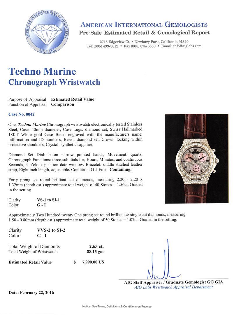 One, Techno Marine Chronograph wristwatch electronically tested Stainless Steel, Case: 40mm diameter, Case Lugs: diamond set, Swiss Hallmarked 18KT White gold Case Back: engraved with the manufacturers name, information and ID numbers, Bezel: diamond set, Crown: locking within protective shoulders, Crystal: synthetic sapphire. Diamond Set Dial: baton narrow pointed hands, Movement: quartz, Chronograph Functions: three sub dials for; Hours, Minutes, and continuous Seconds, 4 o'clock position date window. Bracelet: saddle stitched leather strap, Eight inch length, adjustable. Condition: G-5 Fine. Containing: Forty prong set round brilliant cut diamonds, measuring 2.20 - 2.20 x 1.32mm (depth est.) approximate total weight of 40 Stones = 1.56ct. Graded in the setting. Clarity: VS-1 to SI-1. Color: G - I Approximately Two Hundred twenty One prong set round brilliant & single cut diamonds, measuring 1.50 - 0.80mm (depth est.) approximate total weight of 50 Stones = 1.07ct. Graded in the setting. Clarity: VVS-2 to SI-2. Color: G - I. Total Weight of Diamonds 2.63ct. Total Weight of Wristwatch 88.15gm. AIG Appraised at $7,990.00.
