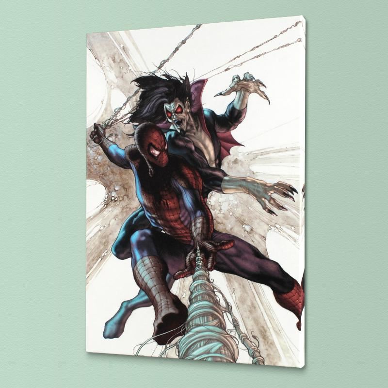 A piece of comic book history, this limited edition, from original art by Simone Bianchi, depicts the classic characters Spider-Man and Morbius. Known for his use of ink wash in his work, Simone Bianchi is an Italian comic book artist famous for his X-Men Unlimited artwork. "The Amazing Spider-Man #622" is a limited edition numbered giclee on stretched canvas by Simone Bianchi presented by Marvel Comics. This piece comes gallery wrapped. Includes Certificate of Authenticity! Measure approx. 18" x 27" (image); 1.5" (depth).