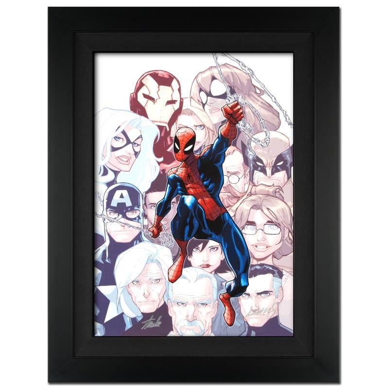 A piece of comic book history, this limited edition, from original art by Humberto Ramos, depicts the classic characters Spider-Man, Captain America, and Iron Man, among others. Mexican comic book artist Humberto Ramos is best known for his work on Impulse, The Spectacular Spider-Man, and The Amazing Spider-Man. Ramos also created his own horror fantasy comic book series, Crimson. "The Amazing Spider-Man #648" a limited edition giclee on canvas by Humberto Ramos presented by Marvel Comics, hand signed by Ramos and the great Stan Lee and numbered out of only 10! This piece is custom framed and ready to hang. Includes Certificate of Authenticity! Measures approx. 25" x 34" (with frame), 18" x 27" (image).