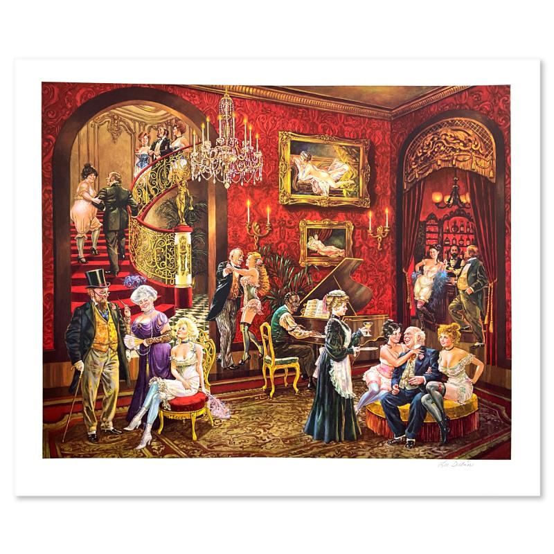 The Bordello by Dubin, Lee. "The Bordello" is a limited edition lithograph on paper by Lee Dubin, numbered and hand signed by the artist. Includes Letter of Authenticity. Measures approx. 34" x 28" (with border), 30" x 24" (image). Due to the age of this