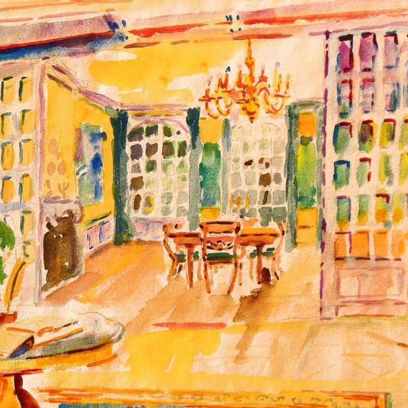 "The Dining Salon of Chateau Bouscaut" is an original Watercolor on Paper by Wayne Ensrud. The piece is hand signed by the artist and comes with a Certificate of Authenticity. Measures approximately 16" x 20".