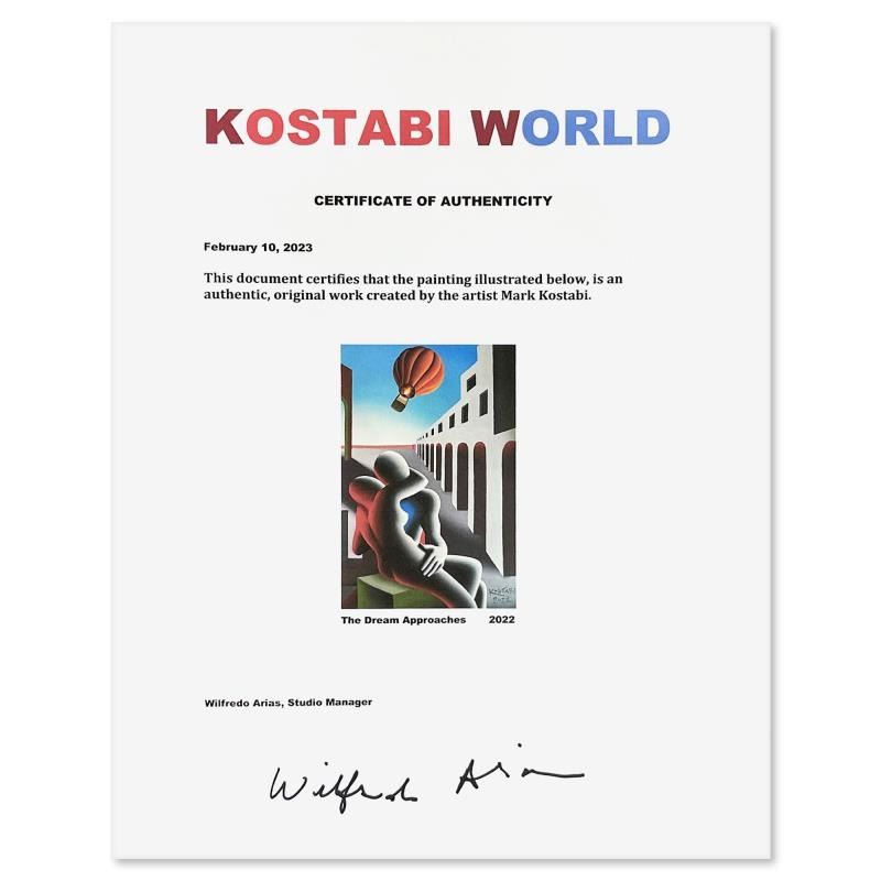 "The Dream Approaches" is an original oil painting on canvas by Mark Kostabi, hand signed by the artist. This piece comes framed. Includes Letter of Authenticity. Measures approx. 18" x 25" (frame), 13.5" x 20.5" (image).