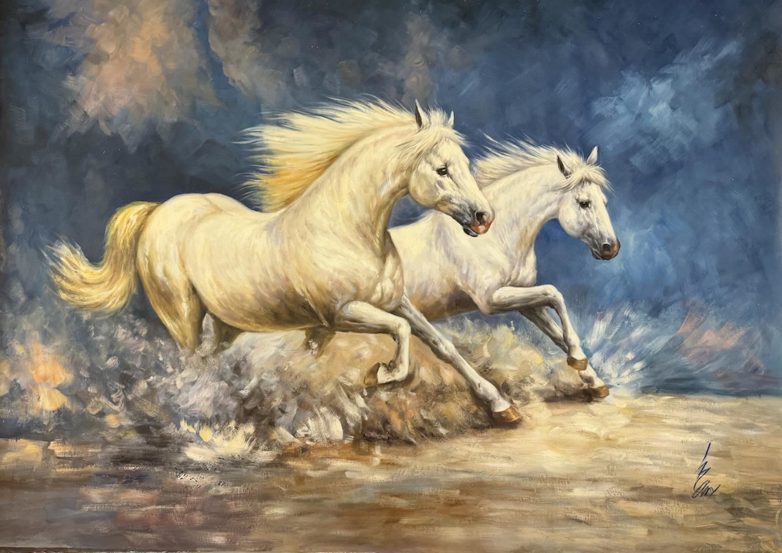 Two riderless horses heading somewhere on their own. Original by Inam. Oil on Canvas 40x60 w/COA