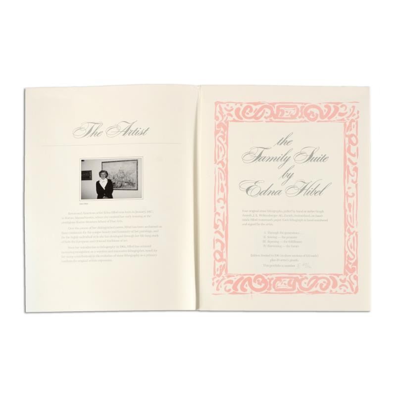 "The Family Suite Edition I" is a 4-piece set of limited edition lithographs on paper celebrating the beauty of family in all of its four stages: "Sowing - The Promise", "Ripening - The Fulfillment", "Harvesting - The Future", and "Through the Generations". Each piece is numbered and hand signed by Edna Hibel (1917-2014). Includes Certificate of Authenticity. Measures approx. 14" x 18" (box); 12" x 16" (each lithograph).