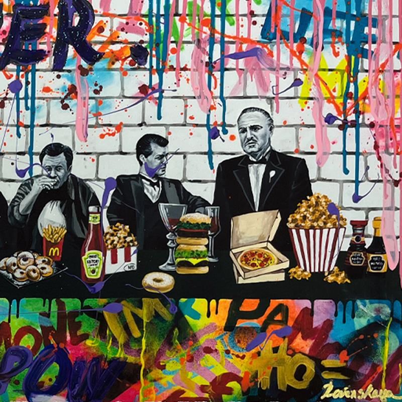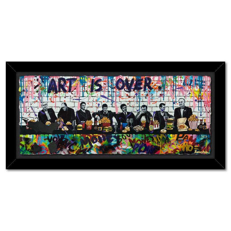 "The Last Meal" is a one-of-a-kind mixed media on deckle edge paper by Nastya Rovenskaya; hand signed by the artist. This piece comes custom framed and includes letter of authenticity. Measures approximately 16" x 31" (framed), 10" x 25" (image).
