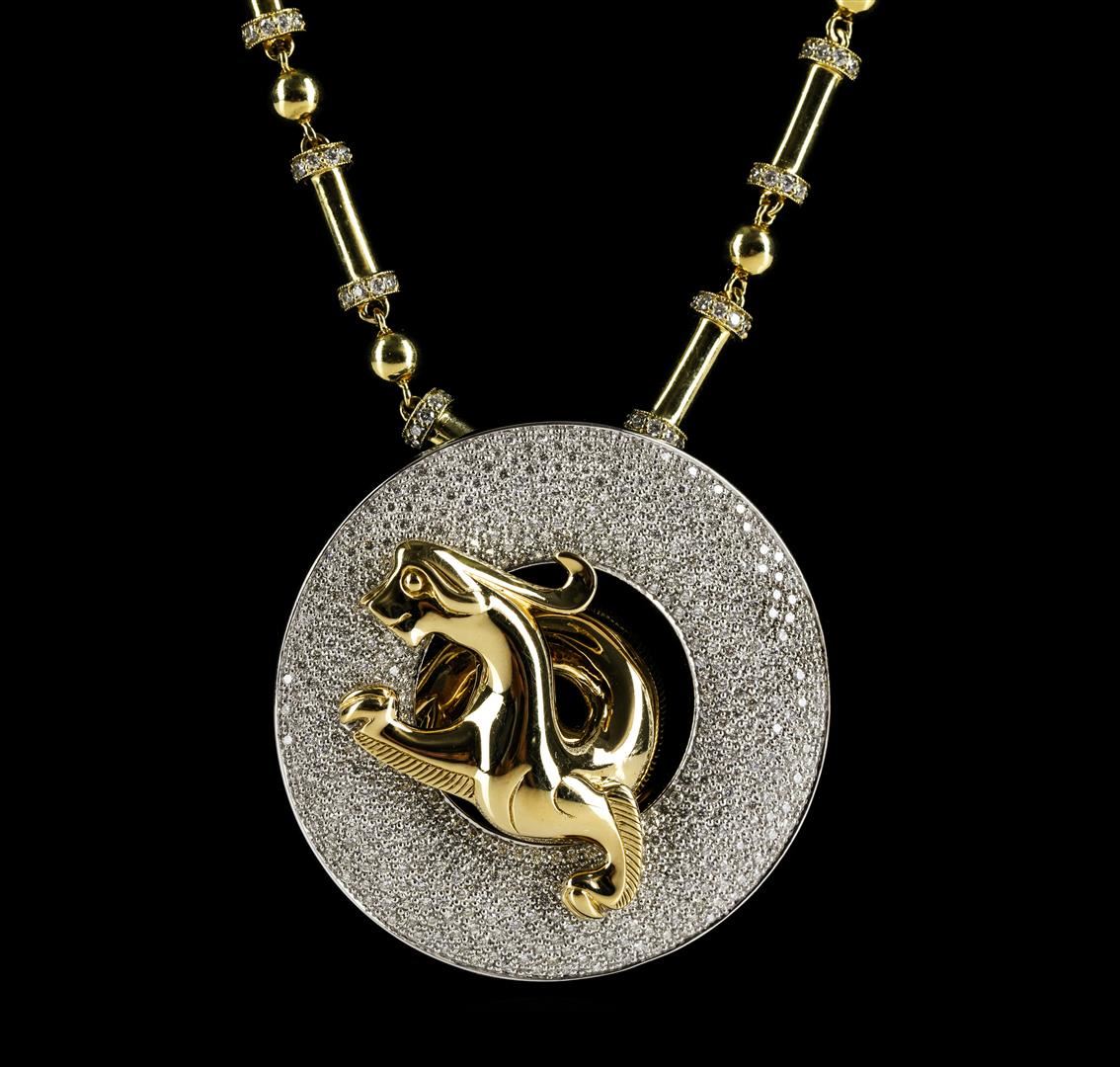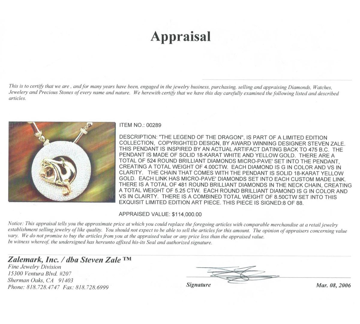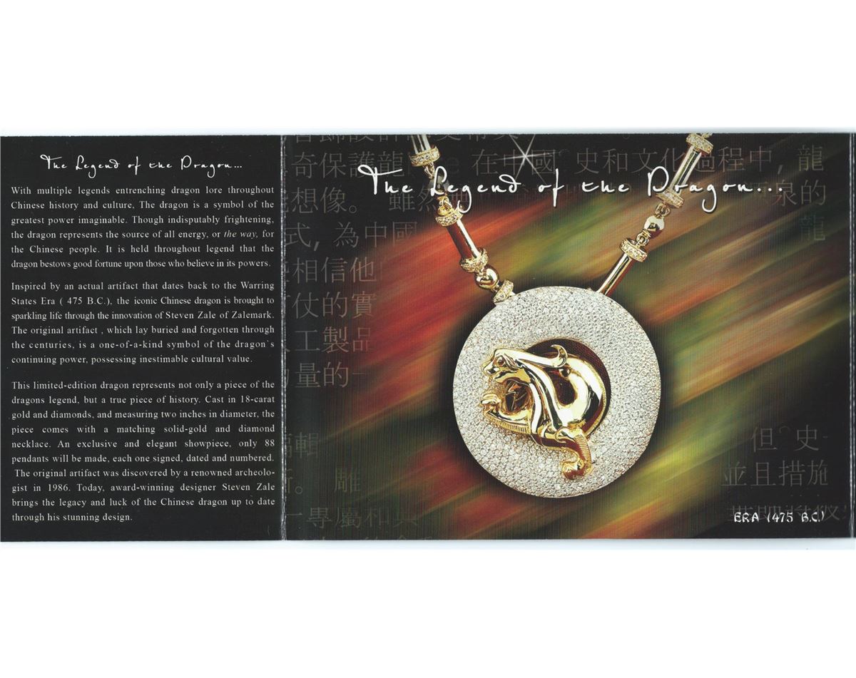 "The Legend of the Dragon", is part of a limited edition collection, copyrighted design, by award winning designer Steven Zale. This pendant is inspired by an actual artifact dating back to 475 B.C. The pendant is made of solid 18-karat white and yellow gold. There are a total of 524 round brilliant diamonds micro-pave' set into the pendant, creating a total weight of 4.00ctw. Each diamond is G in color and VS in clarity. The chain that comes with the pendant is solid 18-karat yellow gold. Each link has micro-pave' diamonds set into each custom made link. There is a total of 481 round brilliant diamonds in the neck chain, creating a total weight of 5.25ctw. Each round brilliant diamond is G in color and VS in clarity. There is a combined total weight of 8.50ctw set into this exquisite limited edition art piece. This piece is signed: 8 of 88. With multiple legends entrenching the dragon lore throughout Chinese history and culture, The Dragon is a symbol of the greatest power imaginable. Though indisputably frightening, the dragon represents the source of all energy, or the way, for the Chinese people. It is held throughout legend that the dragon bestows good fortune upon those who believe in its powers. Inspired by an actual artifact that dates back to the Warring States Era (475 B.C.), the iconic Chinese dragon is brought to sparkling life through the innovation of Steven Zale of Zalemark. The original artifact, which lay buried and forgotten through the centuries, is a one-of-a-kind symbol of the dragon's continuing power, possessing inestimable cultural value. Cast in 18-karat gold and diamonds, and measuring two inches in diameter, the piece comes with a matching solid-gold and diamond necklace as described above. The original artifact was discovered by a renowned archeologist in 1986. Today, award-winning designer Steven Zale brings the legacy and luck of the Chinese dragon up to date through his stunning design.
