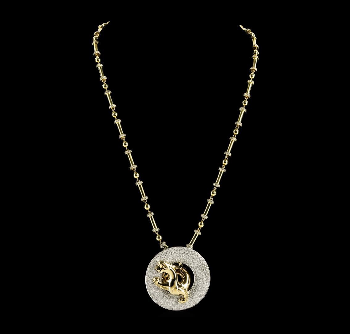 The Legend of the Dragon, is part of a limited edition collection, copyrighted design, by award winning designer Steven Zale. This pendant is inspired by an actual artifact dating back to 475 B.C. The pendant is made of solid 18-karat white and yellow gold. There are a total of 524 round brilliant diamonds micro-pave' set into the pendant, creating a total weight of 4.00 ctw. Each diamond is G in color and VS in clarity. The chain that comes with the pendant is solid 18-karat yellow gold. Each link has micro-pave' diamonds set into each custom made link. There is a total of 481 round brilliant diamonds in the neck chain, creating a total weight of 5.25ctw. Each round brilliant diamond is G in color and VS in clarity. There is a combined total weight of 8.50 ctw set into this exquisite limited edition art piece. This piece is signed: 8 of 88. With multiple legends entrenching the dragon lore throughout Chinese history and culture, The Dragon is a symbol of the greatest power imaginable. Though indisputably frightening, the dragon represents the source of all energy, or the way, for the Chinese people. It is held throughout legend that the dragon bestows good fortune upon those who believe in its powers. Inspired by an actual artifact that dates back to the Warring States Era (475 B.C.), the iconic Chinese dragon is brought to sparkling life through the innovation of Steven Zale of Zalemark. The original artifact, which lay buried and forgotten through the centuries, is a one-of-a-kind symbol of the dragon's continuing power, possessing inestimable cultural value. Cast in 18-karat gold and diamonds, and measuring two inches in diameter, the piece comes with a matching solid-gold and diamond necklace as described above. The original artifact was discovered by a renowned archeologist in 1986. Today, award-winning designer Steven Zale brings the legacy and luck of the Chinese dragon up to date through his stunning design.