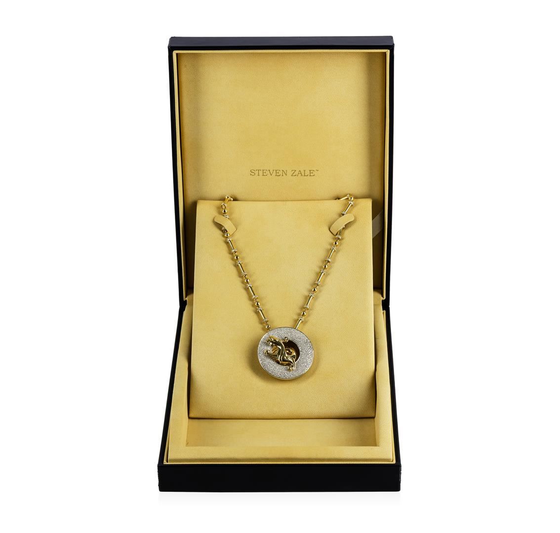 The Legend of the Dragon, is part of a limited edition collection, copyrighted design, by award winning designer Steven Zale. This pendant is inspired by an actual artifact dating back to 475 B.C. The pendant is made of solid 18-karat white and yellow gold. There are a total of 524 round brilliant diamonds micro-pave' set into the pendant, creating a total weight of 4.00 ctw. Each diamond is G in color and VS in clarity. The chain that comes with the pendant is solid 18-karat yellow gold. Each link has micro-pave' diamonds set into each custom made link. There is a total of 481 round brilliant diamonds in the neck chain, creating a total weight of 5.25ctw. Each round brilliant diamond is G in color and VS in clarity. There is a combined total weight of 8.50 ctw set into this exquisite limited edition art piece. This piece is signed: 8 of 88. With multiple legends entrenching the dragon lore throughout Chinese history and culture, The Dragon is a symbol of the greatest power imaginable. Though indisputably frightening, the dragon represents the source of all energy, or the way, for the Chinese people. It is held throughout legend that the dragon bestows good fortune upon those who believe in its powers. Inspired by an actual artifact that dates back to the Warring States Era (475 B.C.), the iconic Chinese dragon is brought to sparkling life through the innovation of Steven Zale of Zalemark. The original artifact, which lay buried and forgotten through the centuries, is a one-of-a-kind symbol of the dragon's continuing power, possessing inestimable cultural value. Cast in 18-karat gold and diamonds, and measuring two inches in diameter, the piece comes with a matching solid-gold and diamond necklace as described above. The original artifact was discovered by a renowned archeologist in 1986. Today, award-winning designer Steven Zale brings the legacy and luck of the Chinese dragon up to date through his stunning design.