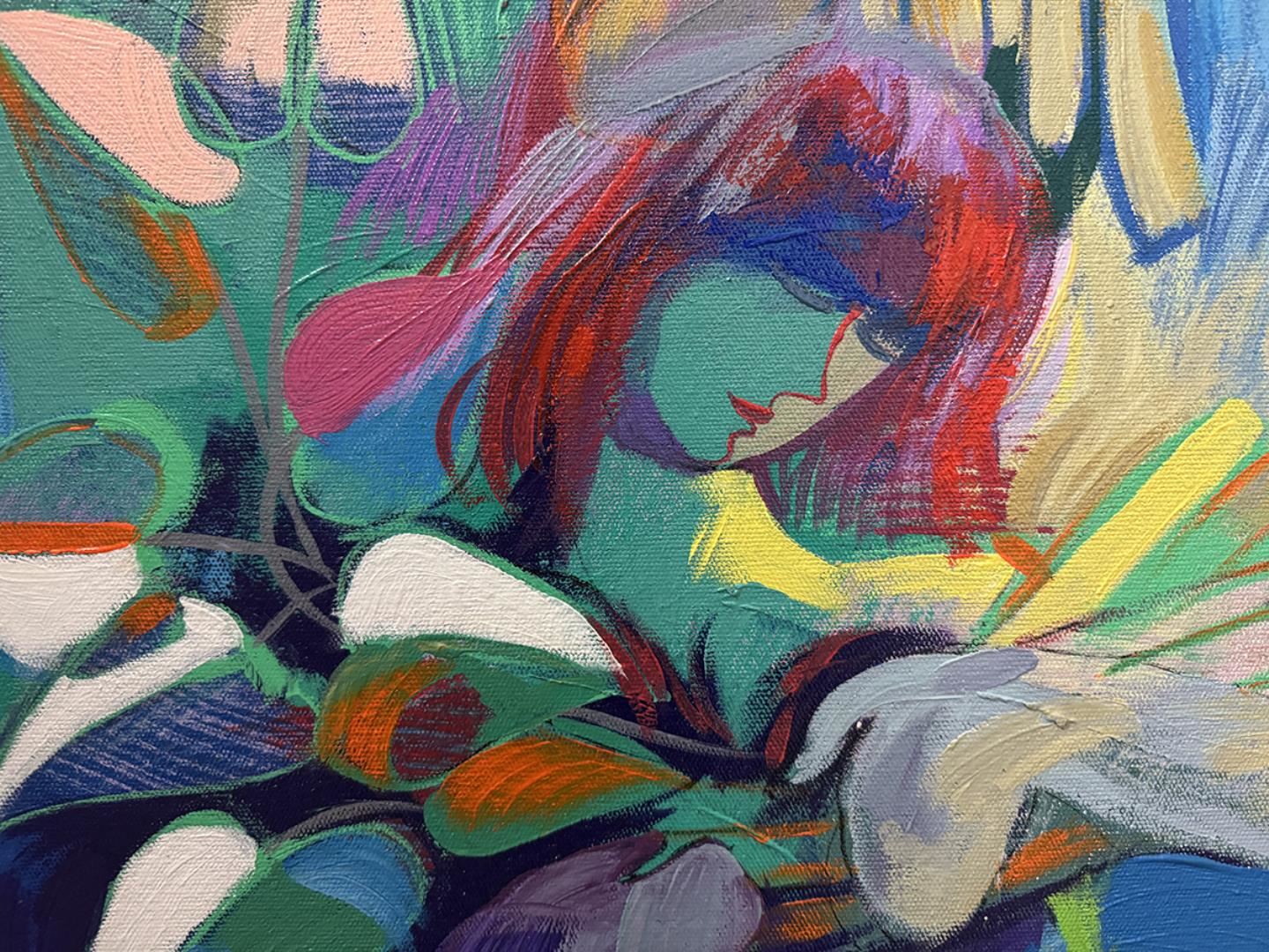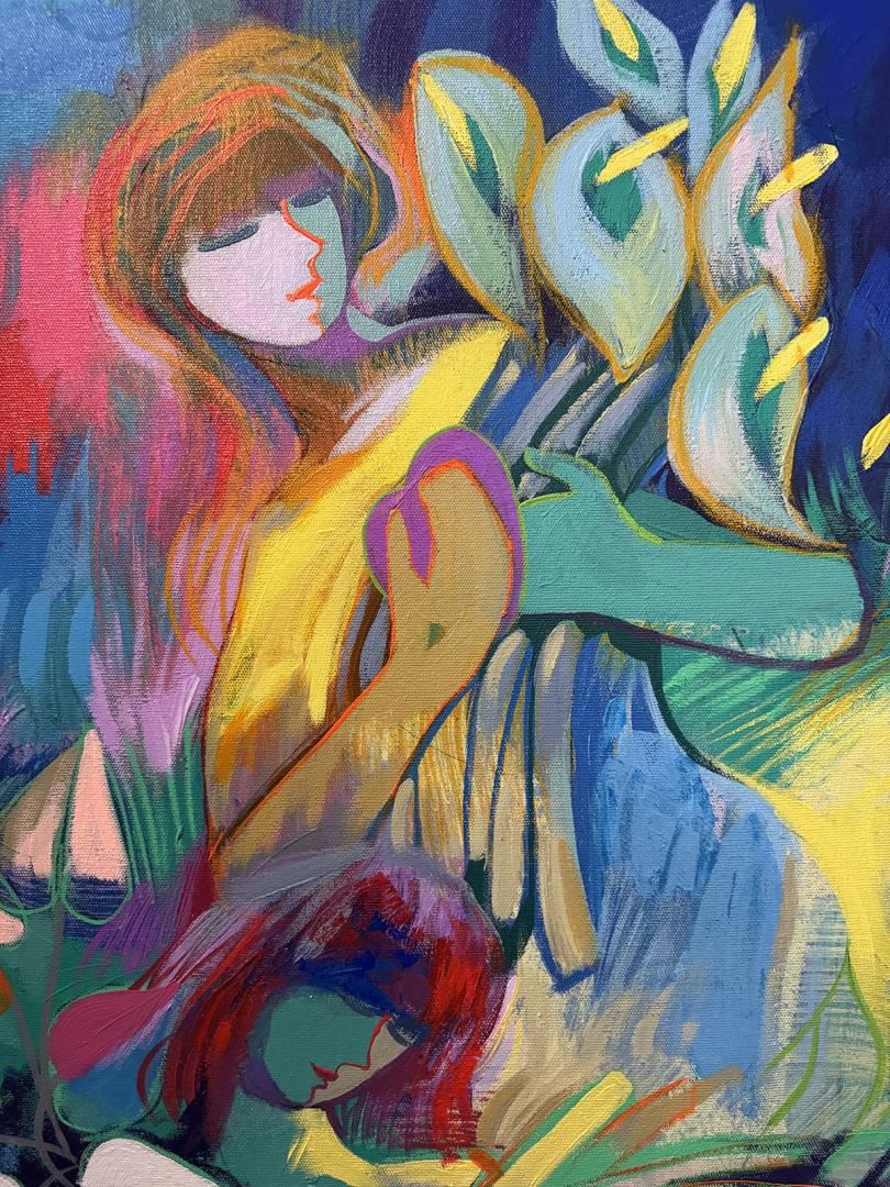 This magnificent original oil artwork, a striking blend of colors and forms, is meticulously created on canvas and hand-signed by the artist. Art size 27x59" framed size 29x61"