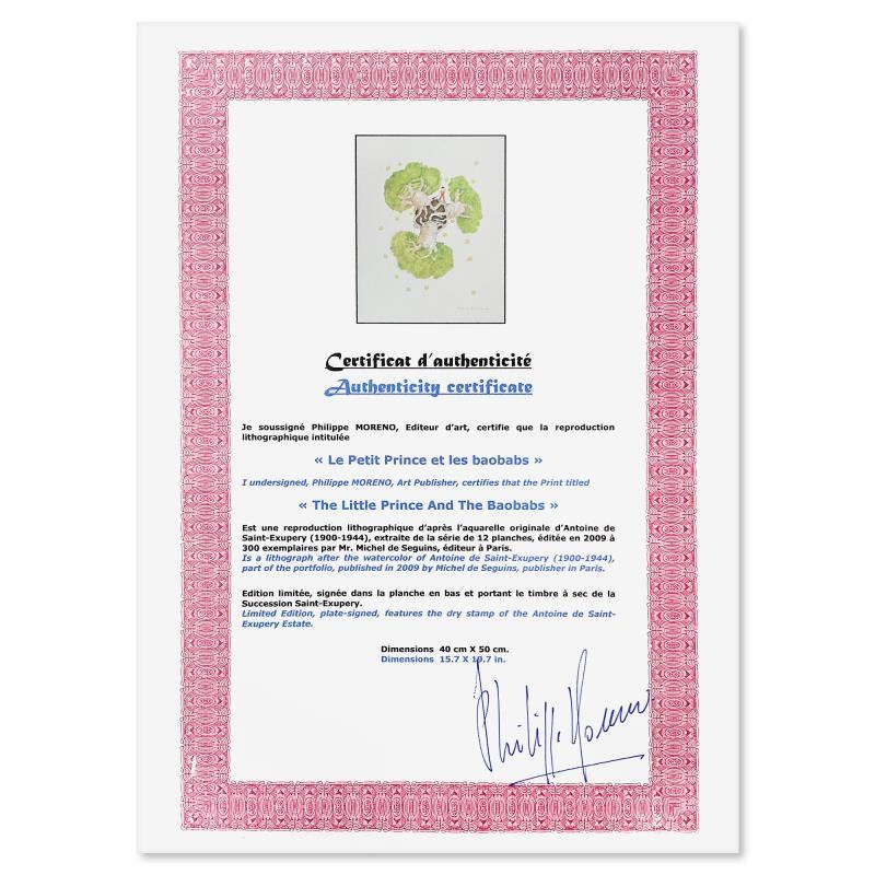 "The Little Prince And The Baobabs" is a limited edition lithograph by Antoine de Saint-Exupery (1900-1944), bearing the plate signature of the artist. This piece comes from an edition of 300 authorized by the Exupery Estate, but the pieces in this edition are not individually numbered. Includes Certificate of Authenticity. Measures approx. 21.5" x 25.5" (frame), 15.5" x 19.5" (image).