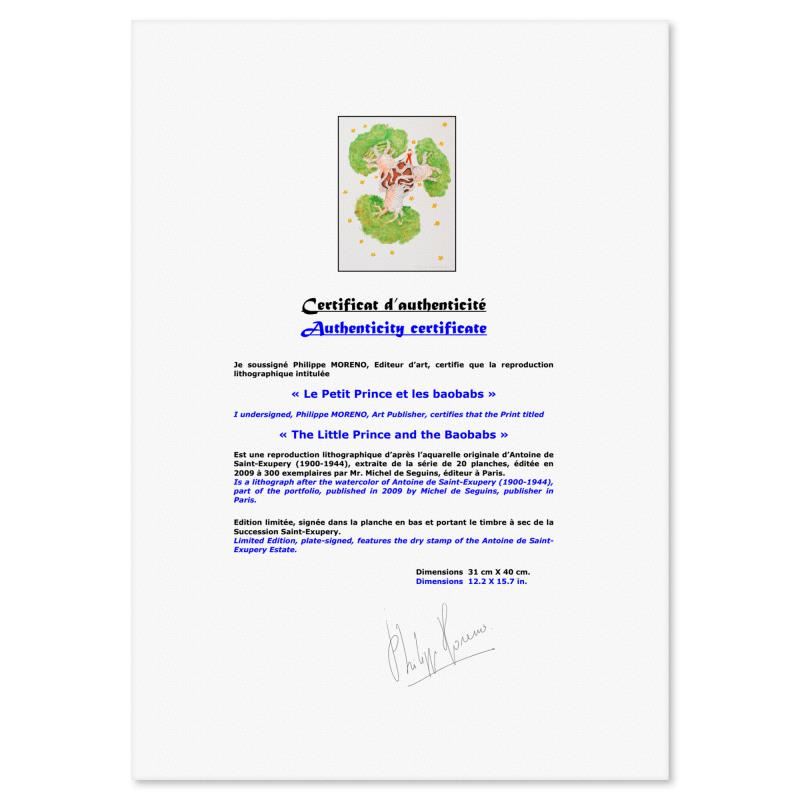 "The Little Prince And The Baobabs" is a limited edition lithograph on paper by Antoine de Saint-Exupery 1900-1944 (After), bearing the plate signature of the artist.This piece comes from an edition of 300 authorized by the Exupery Estate, but the pieces in this edition are not individually numbered. This piece comes custom framed. Includes Certificate of Authenticity. Measures approx. 20" x 16" (frame) 16" x 12" (image). This item requires special handling and may have a longer than usual turnaround.