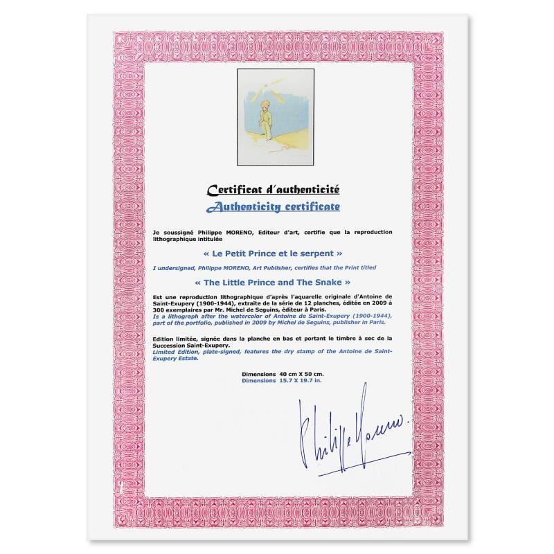 "The Little Prince And The Snake at the Wall" is a limited edition lithograph by Antoine de Saint-Exupery (1900-1944), bearing the plate signature of the artist. This piece comes from an edition of 300 authorized by the Exupery Estate, but the pieces in this edition are not individually numbered. Includes Certificate of Authenticity. Measures approx. 21.5" x 25.5" (frame), 15.5" x 19.5" (image).