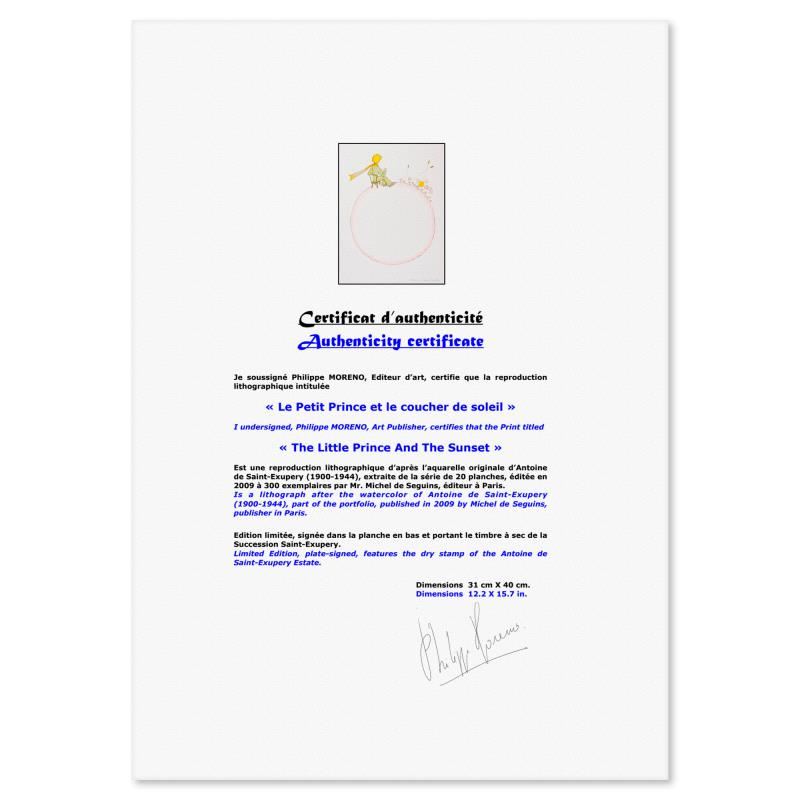 "The Little Prince And The Sunset" is a limited edition lithograph on paper by Antoine de Saint-Exupery 1900-1944 (After), bearing the plate signature of the artist.This piece comes from an edition of 300 authorized by the Exupery Estate, but the pieces in this edition are not individually numbered. This piece comes custom framed. Includes Certificate of Authenticity. Measures approx. 20" x 16" (frame) 16" x 12" (image). This item requires special handling and may have a longer than usual turnaround.