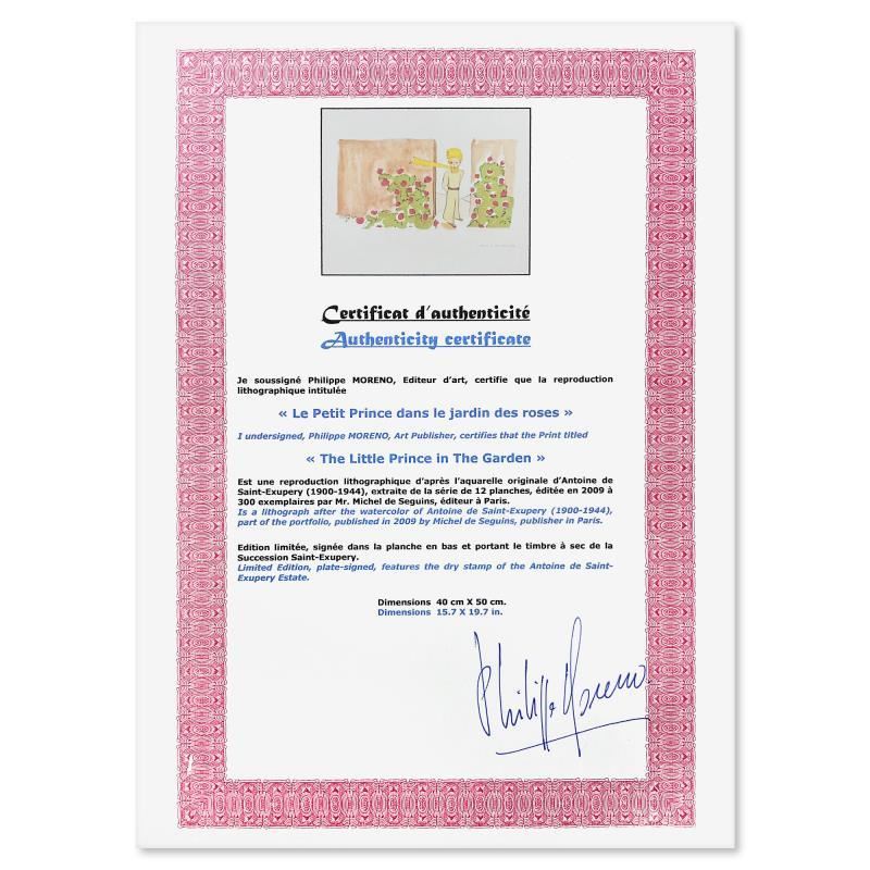 "The Little Prince In The Garden" is a limited edition lithograph by Antoine de Saint-Exupery (1900-1944), bearing the plate signature of the artist. This piece comes from an edition of 300 authorized by the Exupery Estate, but the pieces in this edition are not individually numbered. Includes Certificate of Authenticity. Measures approx. 25.5" x 20.5" (frame), 19.5" x 15.5" (image).