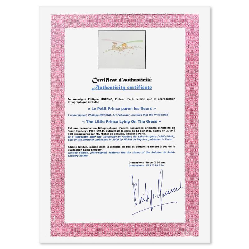 "The Little Prince Lying On The Grass" is a limited edition lithograph by Antoine de Saint-Exupery (1900-1944), bearing the plate signature of the artist. This piece comes from an edition of 300 authorized by the Exupery Estate, but the pieces in this edition are not individually numbered. Includes Certificate of Authenticity. Measures approx. 25.5" x 21.5" (frame), 19.5" x 15.5" (image).