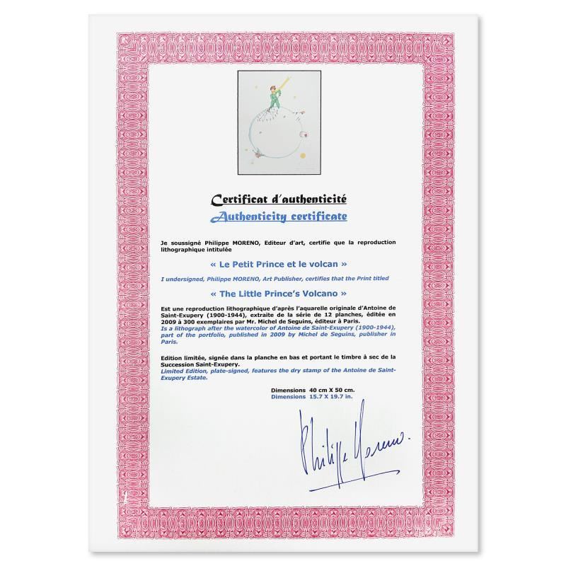 "The Little Prince's Volcano" is a limited edition lithograph by Antoine de Saint-Exupery (1900-1944), bearing the plate signature of the artist. This piece comes from an edition of 300 authorized by the Exupery Estate, but the pieces in this edition are not individually numbered. Includes Certificate of Authenticity. Measures approx. 21.5" x 25.5" (frame), 15.5" x 19.5" (image).
