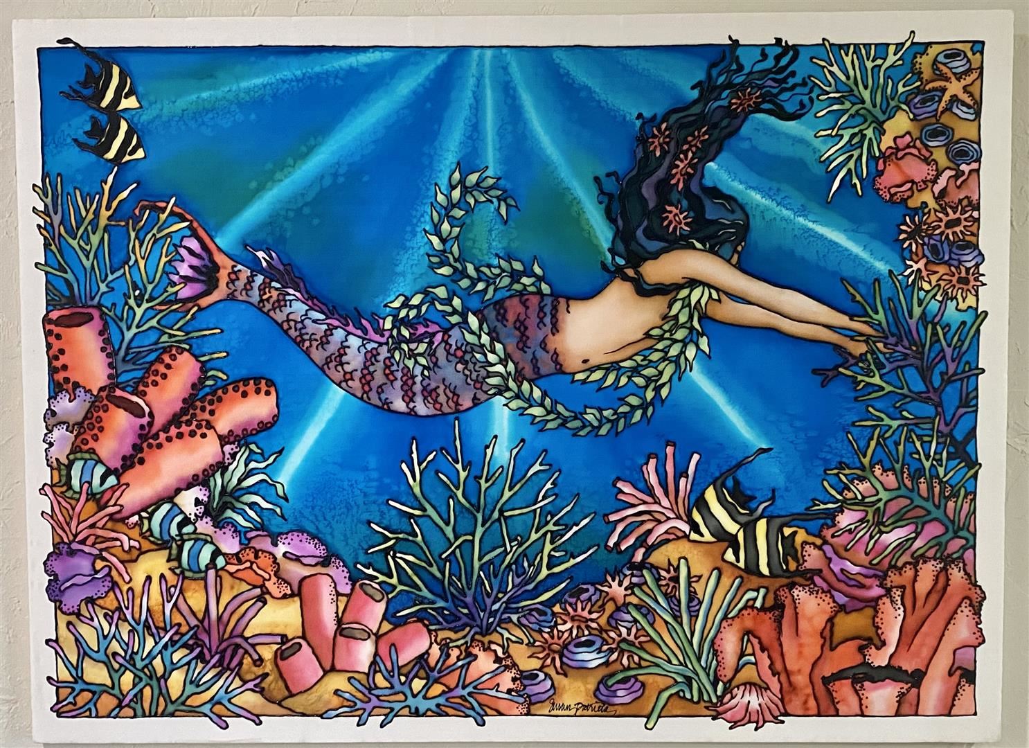 "The Mermaid" by renowned Hawaii artist Susan Patricia, original on silk w/ added texture effect. 38 1/2" x 28 1/2"