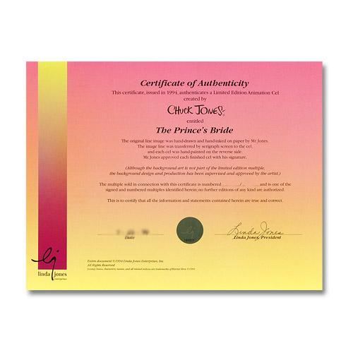 Own this amazing piece based on the original line image hand drawn and hand-inked on paper by Mr. Jones! "The Prince's Bride" is a sold out limited edition animation cel with hand painted coloring on sericel outline, numbered and hand signed by Chuck Jones (1912-2002). Includes Certificate of Authenticity! Measures Approx: 12.5" x 10.5".