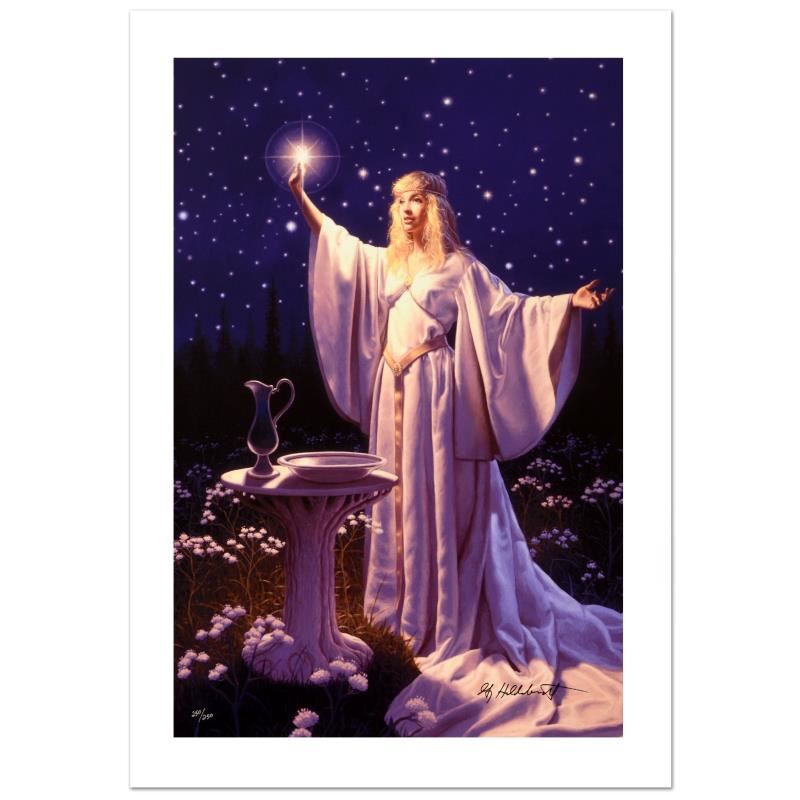 Known world wide for his fantasy and science fiction illustrations, Greg Hildebrandt has created an abundance of fascinating artwork including, and most notably his illustration work for J.R.R. Tolkien's 'The Hobbit' and 'Lord of the Rings'. "The Ring Of Galadriel", originally created in the 1970's for Ballantine Books, is a limited edition giclee on canvas, numbered and hand signed by Greg Hildebrandt! Includes Certificate of Authenticity! Measures approx. Measures approx. 20" x 30" (image).
