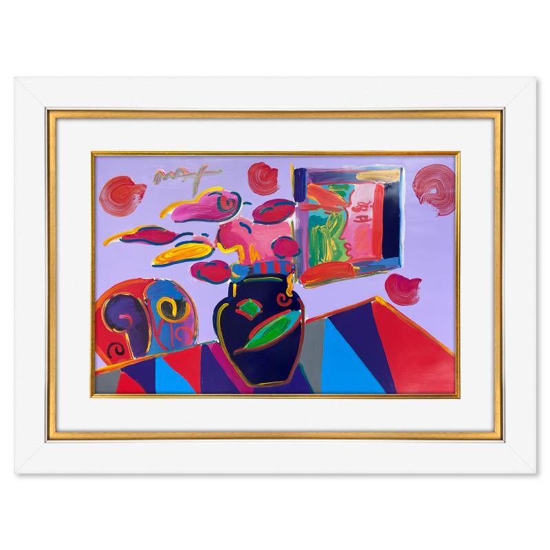 "The Room" is a one-of-a-kind acrylic mixed media on paper, hand signed by Peter Max. The piece comes custom framed with a backside cutout to display Peter Max Studio registration number 255876 certifying authenticity. Measures approx. 36.5" x 48.5" (frame), 24" x 36" (image).