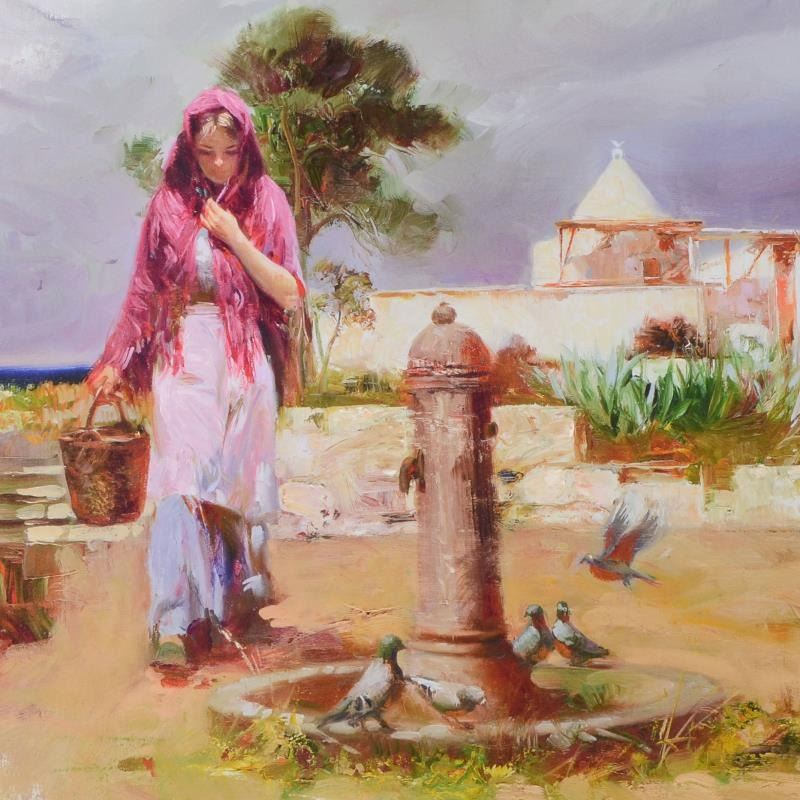 Pino's portraits allow glimpses into intensely personal, intimate spaces, conveying emotion through rich, warm color and sensual brushwork. "The Water Fountain" is an artist-embellished limited edition giclee on canvas by Pino (1939-2010). The piece is numbered, hand signed, custom framed, and includes certificate of authenticity. Measures approx. 52" x 42" (frame), 40" x 30" (image). This item requires special handling and may have a longer than usual turnaround.